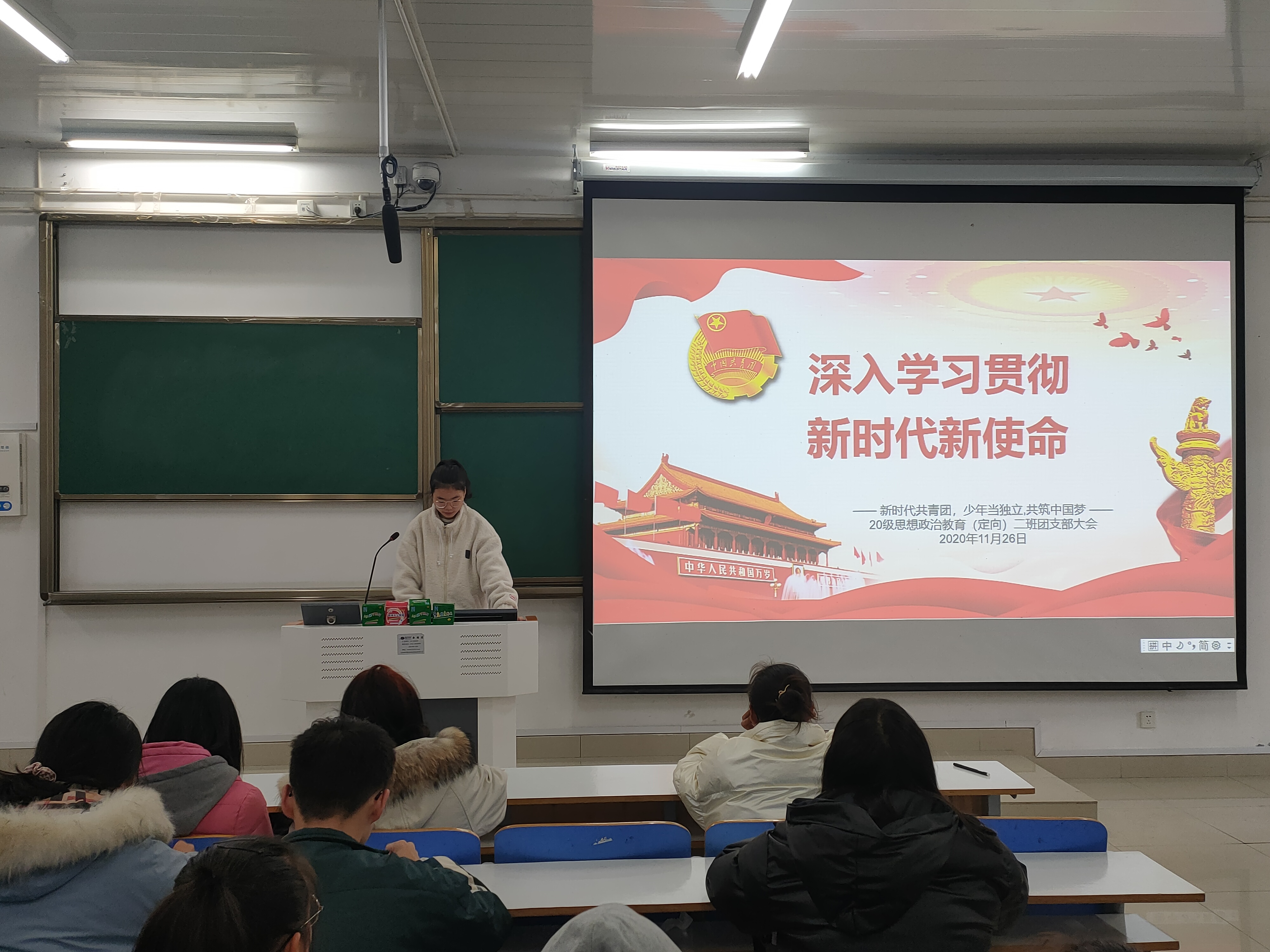 为促进同学们深入学习共青团知识,自觉担当新时代新使命,11月26日,德赢AC米兰官网2020级思想政治教育定向二班“担当新使命,共筑中国梦”主题团支部大会在社科楼514教室顺利召开。定向二班全体团员参与此次会议。大会由团支书李晨曦主持。