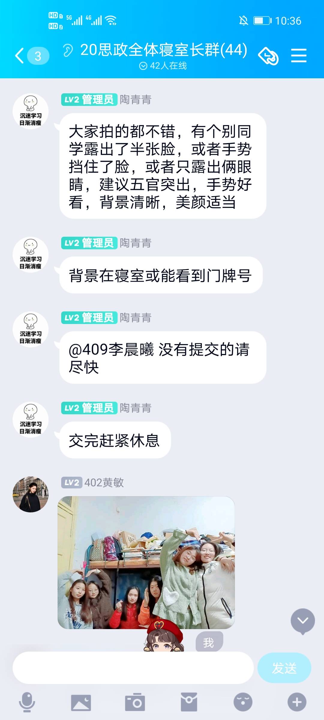 为了解我班同学住宿情况,督促同学们进一步树牢安全意识,12月14日与17日晚,德赢AC米兰官网2020级思想政治教育二班班主任陶青青通过线上云查寝的方式对我班同学住宿情况展开深入检查。