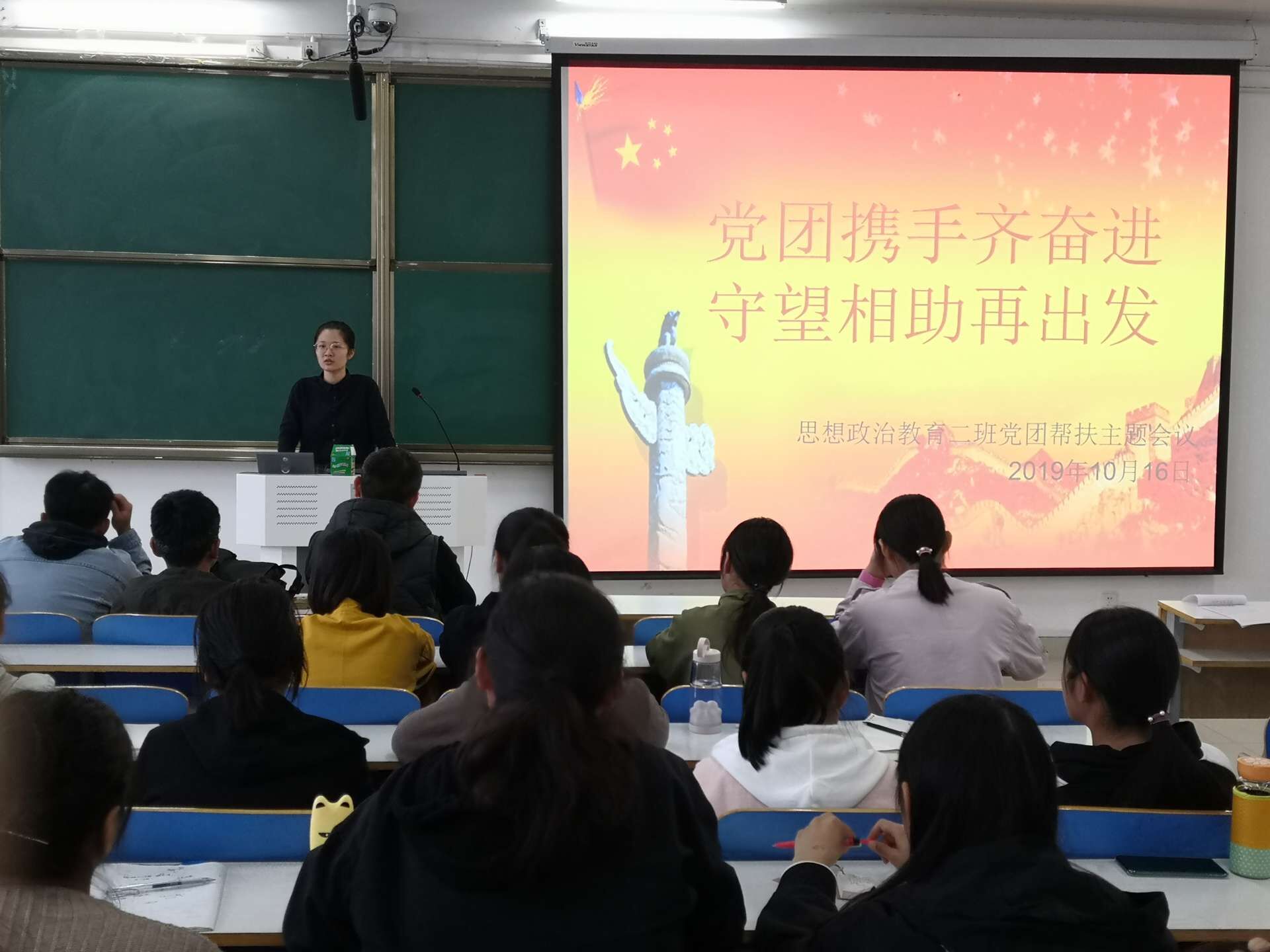 为提高2019级新生适应大学校园生活的能力,10月16日上午,德赢AC米兰官网2019级思想政治教育二班在社科楼514教室顺利开展党团帮扶班会。党团帮扶小组成员张雅琼、刘冰以及2019级思想政治教育二班全体同学共同参会。本次班会由团支书孙雅娴主持。