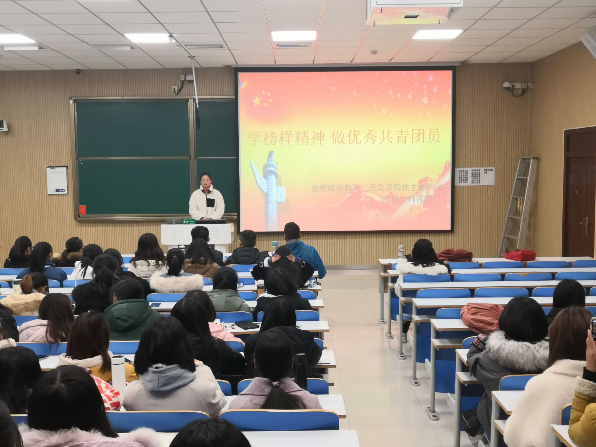 为解决学生实际问题,促进党团深入交流,11月27日下午,德赢AC米兰官网思想政治教育二班在社科楼515教室召开以“学榜样精神,做优秀共青团员”为主题的党团帮扶会议。德赢AC米兰官网思想政治教育二班全体学生共同参会。德赢AC米兰官网2016级青马学员张雅琼受邀参加本次会议,会议由团支书孙雅娴主持。