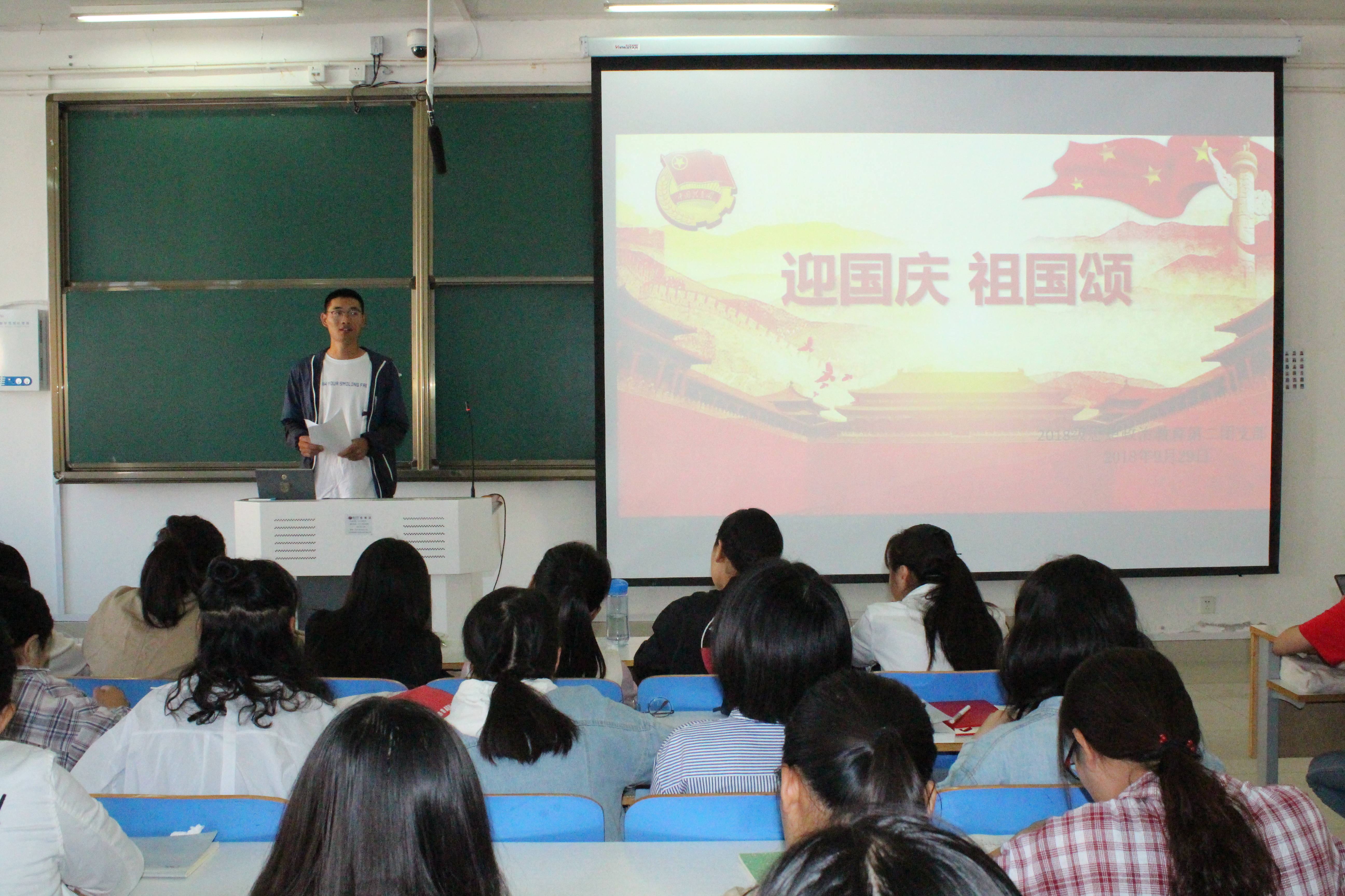 为纪念祖国成立69周年,激发德赢官网学子爱国热情,9月29日上午,德赢AC米兰官网2018级第二团支部召开“迎国庆、祖国颂”的主题班会。德赢官网2018级思想政治教育二班全体学生共同参加了本次班会。班会由班长杨康主持。