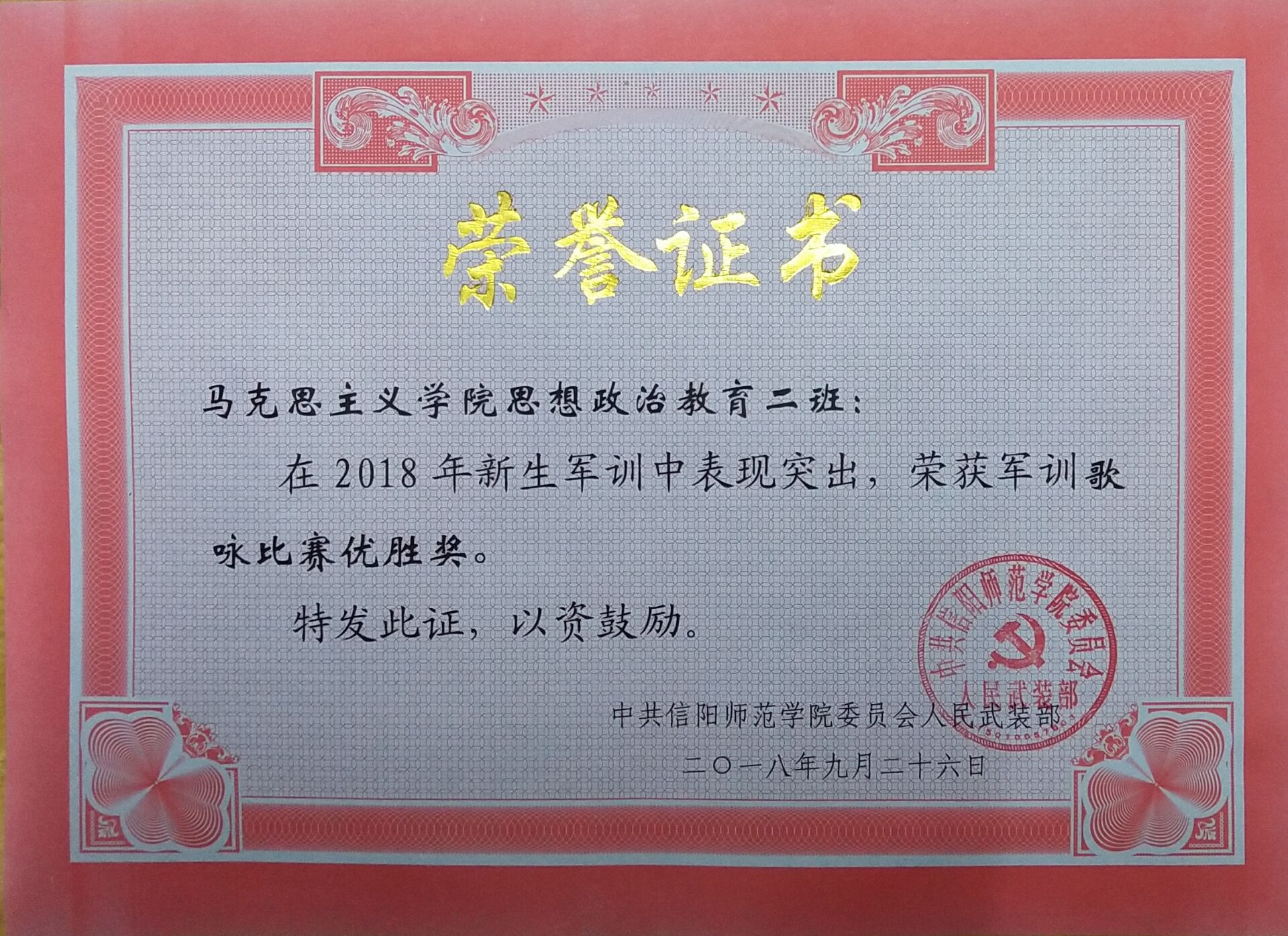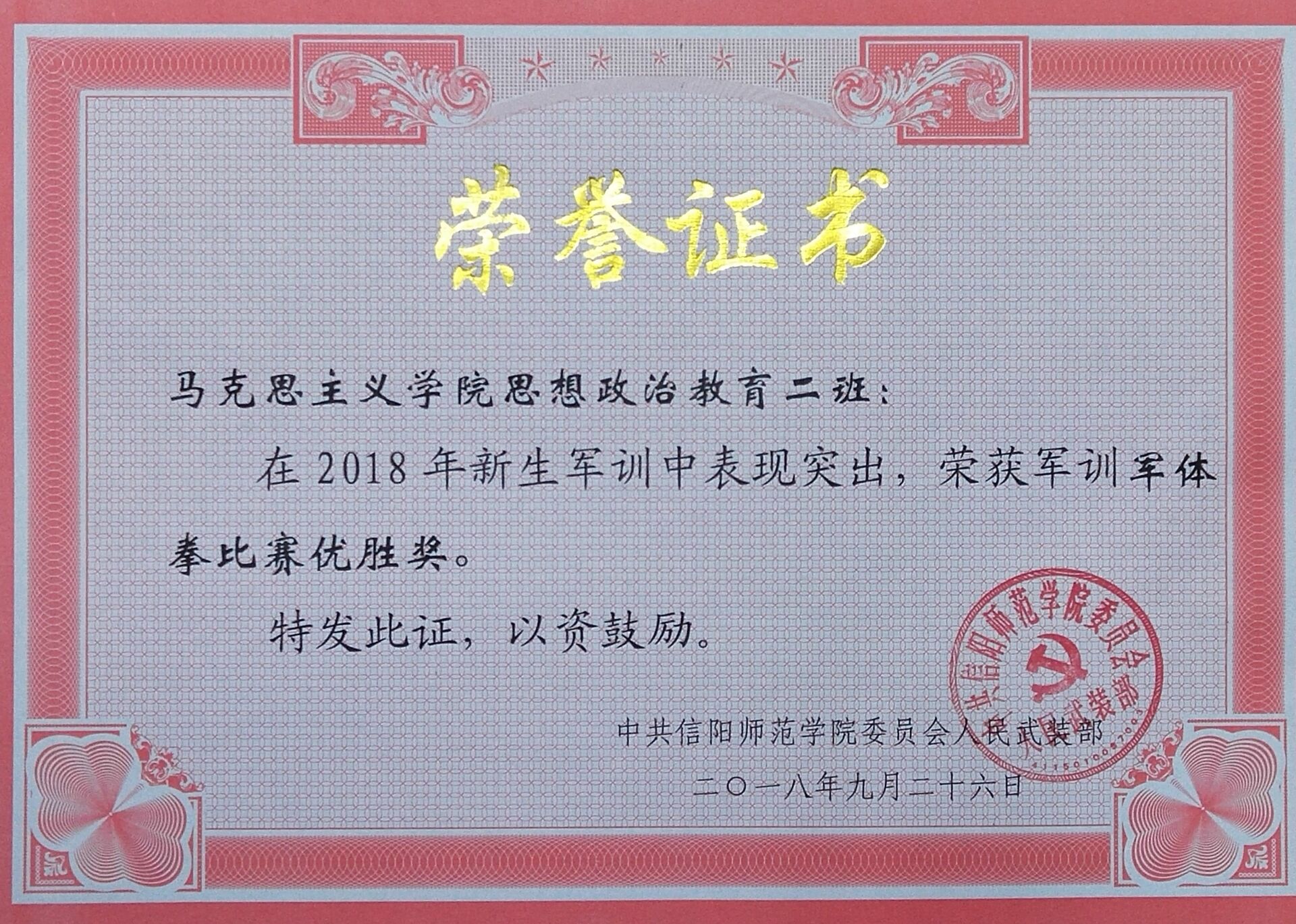 红旗猎猎,军歌嘹亮。9月26日上午,信阳师范学院2018级新生军训成果检验暨表彰大会在西操场召开。我校领导和教官们检阅了各军训方阵。在检阅过程中,由德赢官网的新生组成的军训受阅方队迈着整齐的步伐,喊着响亮的口号,个个军容整肃,雄姿英发,充分展示了2018级德赢AC米兰官网新生昂扬向上的精神面貌。接着,全体2018级新生进行唱军歌、打军体拳等科目展示,展现了同学们的军训成果,尽显高昂士气。在表彰大会上,德赢AC米兰官网2018级思想政治教育二班荣获军训歌咏比赛优胜奖和军体拳比赛优胜奖。除此,杨康、黄子晋被授予军训先进个人的称号。