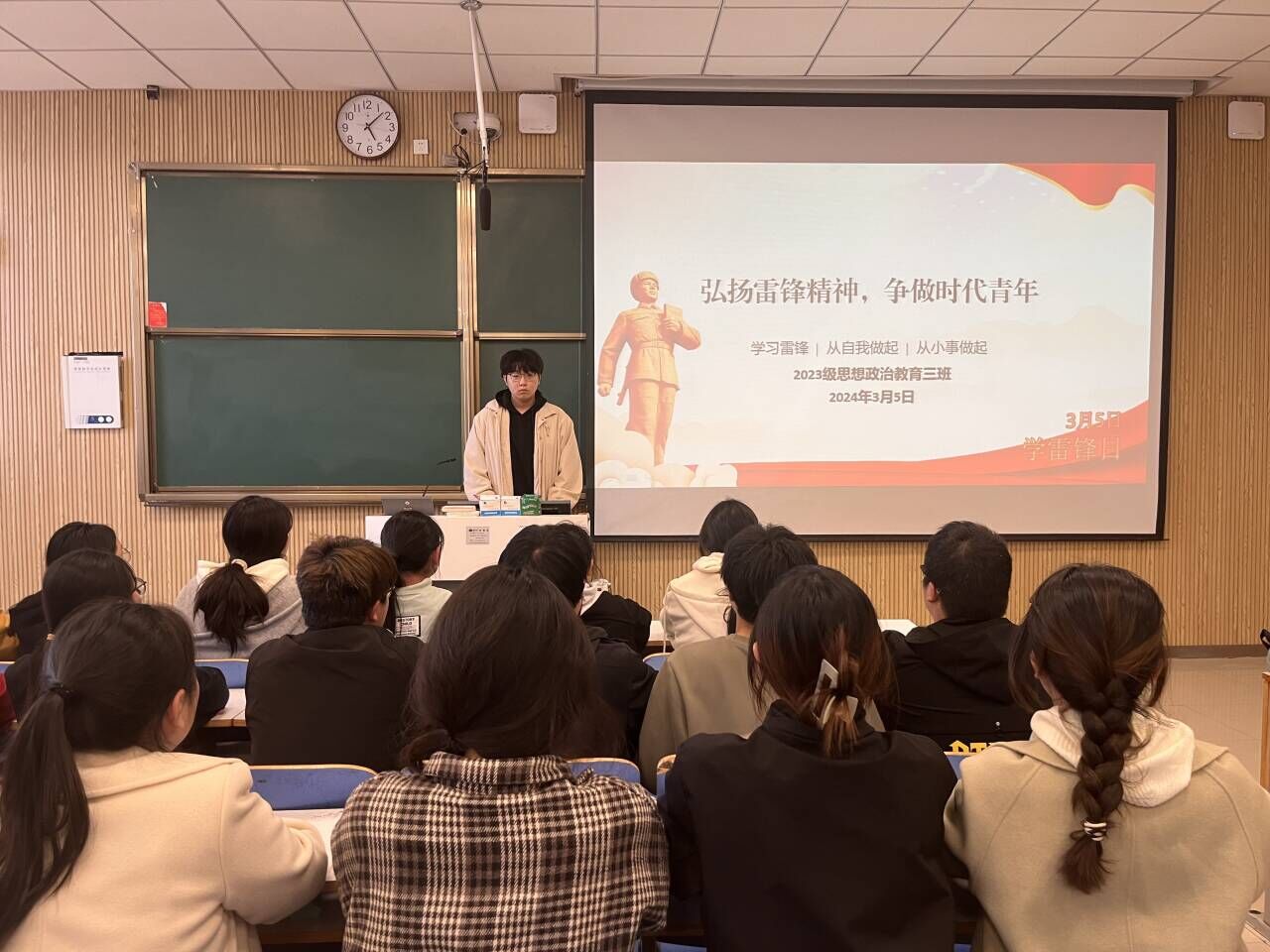 为引导广大青年学子继承优良传统,弘扬志愿服务精神,3月5日上午,德赢AC米兰官网2023级思想政治教育三班在社科楼515教室召开“弘扬雷锋精神,争做时代青年”主题班会。德赢官网2023级思想政治教育三班全体同学共同参与本次班会,班会由团支书郝瀚主持。