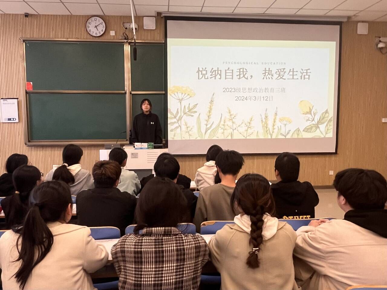 为普及心理健康教育,3月12日上午,德赢AC米兰官网2023级思想政治教育三班在社科楼515教室召开“悦纳自我,热爱生活”心理健康班会。德赢官网2023级思想政治教育三班全体成员共同参加此次班会,班会由心理委员安雅楠主持。
