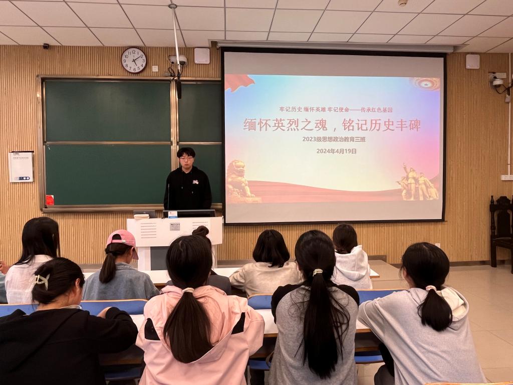 4月19日下午,德赢AC米兰官网2023级思想政治教育三班在社科楼515教室举行“缅怀英烈之魂,铭记历史丰碑”主题团课。德赢官网2023级思想政治教育三班全体成员共同参加此次团课,团课由团支书郝瀚主持。