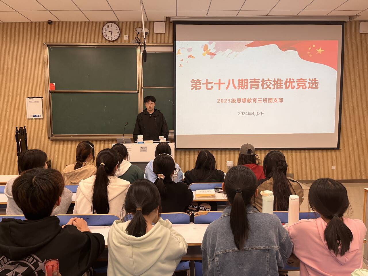 为更好培养和造就社会主义事业的建设者和接班人,充实党的新生力量,4月2日上午,德赢官网2023级思想政治教育三班在社科楼515举行第78期青校推优大会。2023级思想政治教育三班全体同学共同参与本次大会,大会由团支书郝瀚主持。