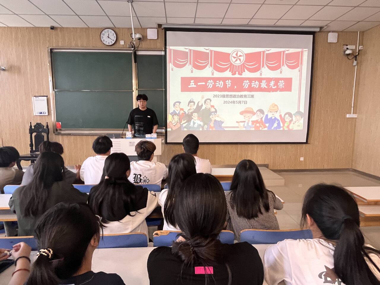 为弘扬劳模精神,发扬劳动传统,5月7日上午,德赢AC米兰官网2023级思想政治教育三班在社科楼515召开“五一劳动节,劳动最光荣”主题班会。德赢官网2023级思想政治教育三班全体同学共同参与本次班会,班会由团支书郝瀚主持。