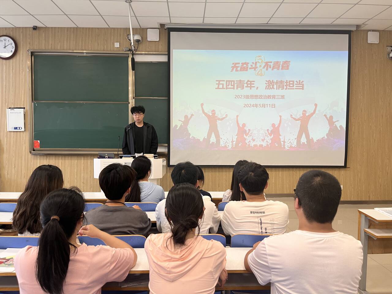 团课伊始,郝瀚围绕五四青年节的由来和内涵进行阐述。他指出,五四青年节源于中国1919年反帝爱国的五四运动,五四精神的核心内容为“爱国、进步、民主、科学”。为更深层次感悟青年使命担当,我班学子共同观看影视剧《觉醒年代》相关片段。接着,学生代表李佩宣发表感悟,她表示,为打破帝国主义和封建主义牢笼,近代中国之青年誓死力争,捍卫国家尊严,我们应发扬这种前赴后继精神,勇于探索,敢于创新,为民族独立解放、国家繁荣富强而奋斗。最后,郝瀚做出总结,“五四青年节”既包含对五四运动的纪念,又包含时代对青年的期盼,生逢盛世,我辈青年应解放思想、破旧立新、积极进取,为强国建设贡献力量。