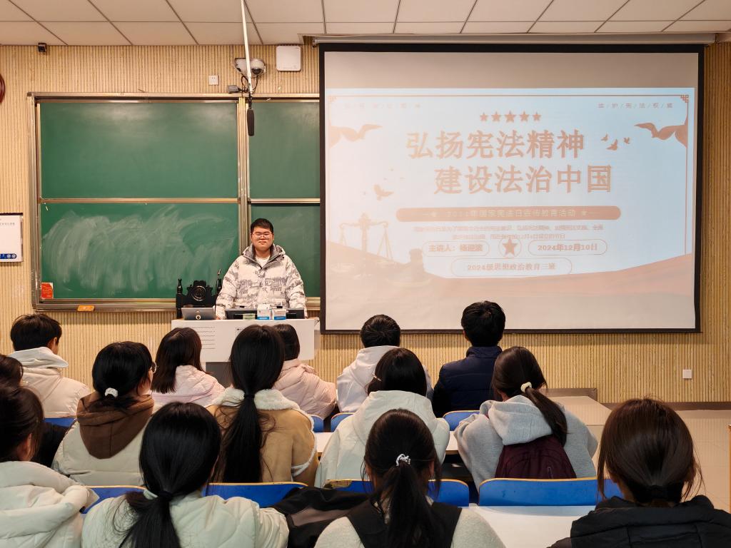 为深入贯彻依法治国理念,增强青年学生的宪法意识与法治观念,德赢AC米兰官网2024思想政治教育三班于12月10日在社科楼515教室成功举办了以“弘扬宪法精神,建设法治中国”为主题的团课活动。本次团课由团支书杨迎滨主持。
