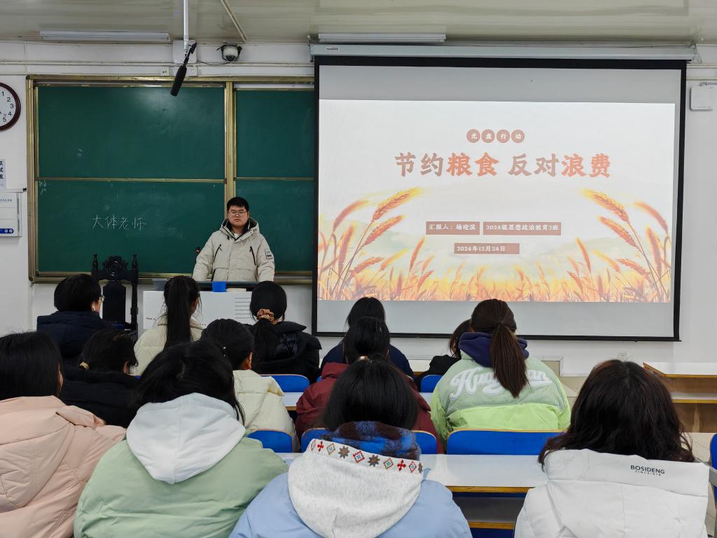 为引导学生们树立珍惜粮食的意识,养成勤俭节约的好习惯,德赢AC米兰官网2024级思想政治教育三班于12月24日在社科楼514教室成功召开了一场以“节约粮食,反对浪费”为主题的班会活动。