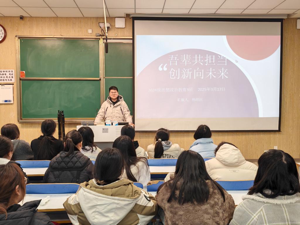 为激发学生的责任感与创新精神,德赢AC米兰官网2024级思想政治教育三班于3月17日在社科楼515举行了一场以 “吾辈共担当,创新向未来” 为主题的班会。此次班会由班长杨迎滨主持,全班同学积极参与,气氛热烈。
