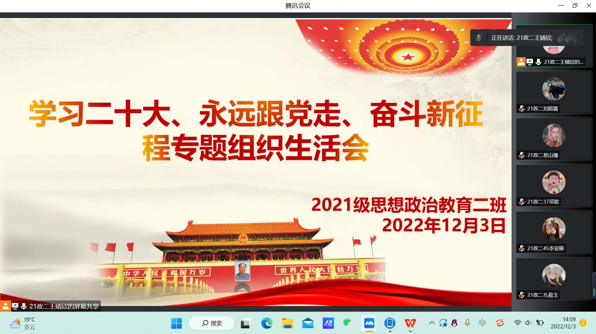 12月3日下午,德赢AC米兰官网2021级思想政治教育二班团支部在腾讯会议召开学习二十大、永远跟党走、奋进新征程专题组织生活会。2021级思想政治教育二班全体团员参加此次组织生活会。组织生活会由团支书王婧欣主持。