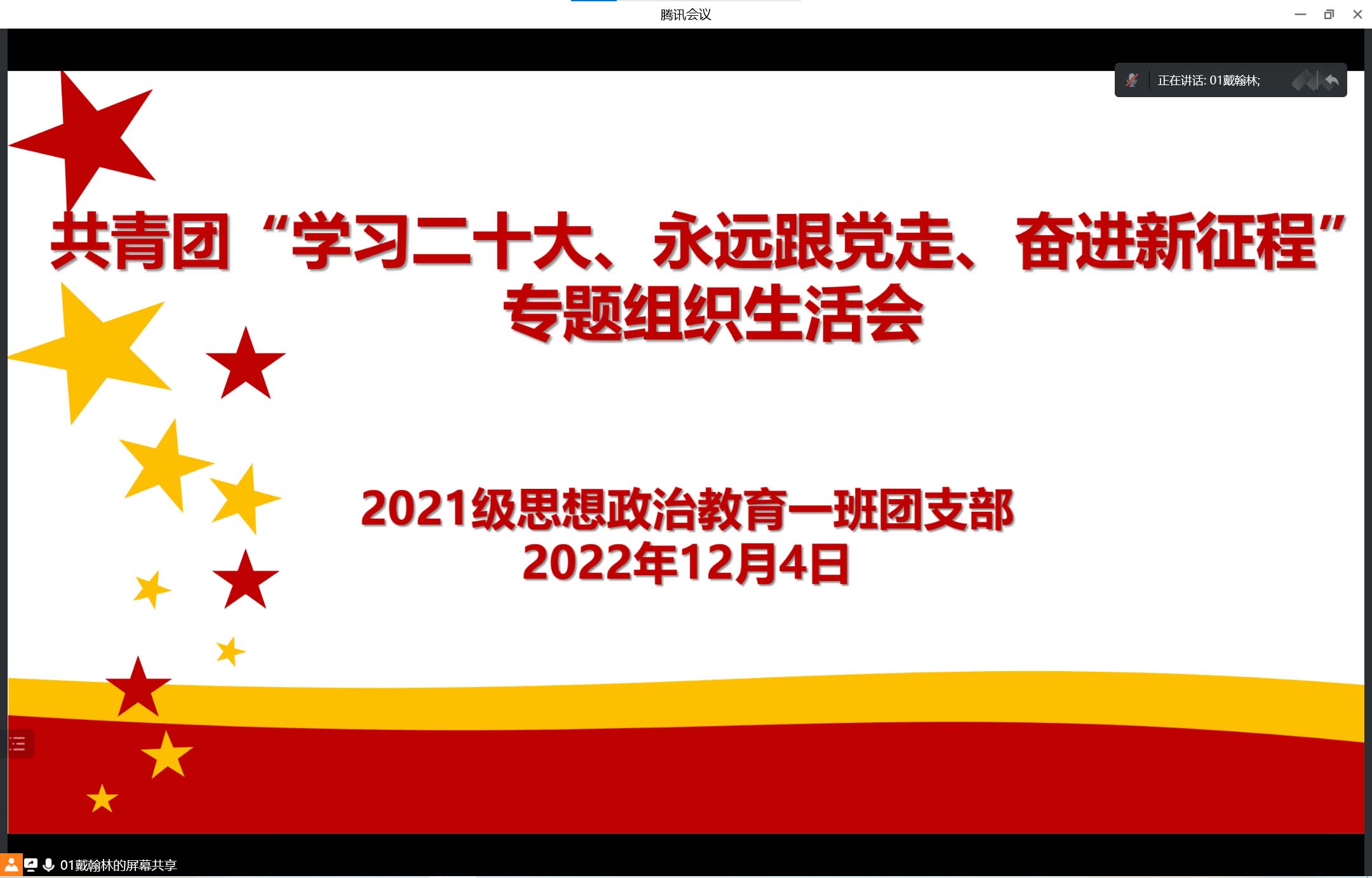12月4日下午,德赢AC米兰官网2021级思想政治教育一班团支部在腾讯会议召开线上“学习二十大、永远跟党走、奋进新征程”专题组织生活会。2021级思想政治教育一班全体团员参加了本次大会。会议由团支书戴翰林主持。