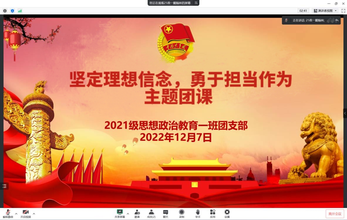 12月7日下午,德赢AC米兰官网2021级思想政治教育一班在腾讯会议召开线上“坚定理想信念,勇于担当作为”主题团课。2021级思想政治教育一班全体团员共同参加了本次团课。团课由团支书戴翰林主持。