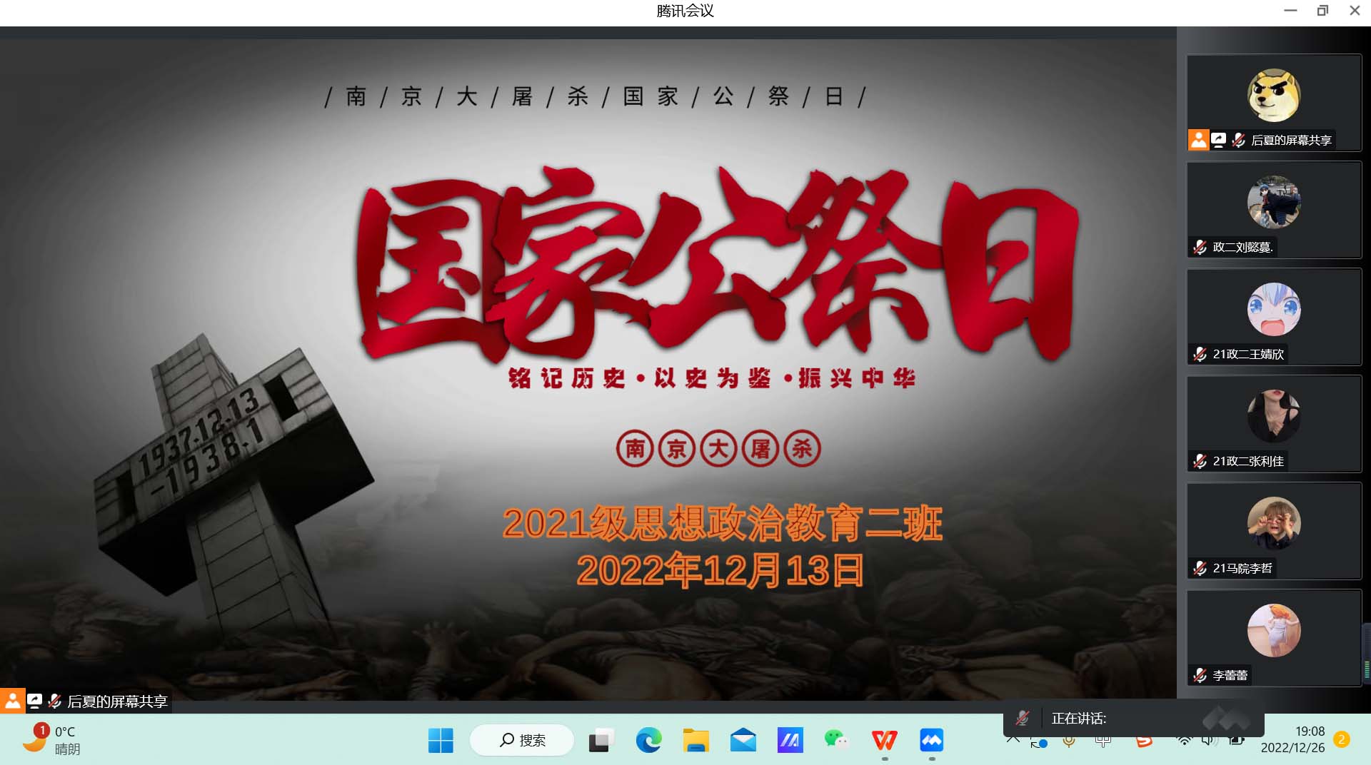 12月13日下午,德赢AC米兰官网2021级思想政治教育二班在腾讯会议召开“铭记历史·以史为鉴·振兴中华”国家公祭日主题班会。2021级思想政治教育二班全体成员共同参加此次班会。班会由团支书王婧欣主持。