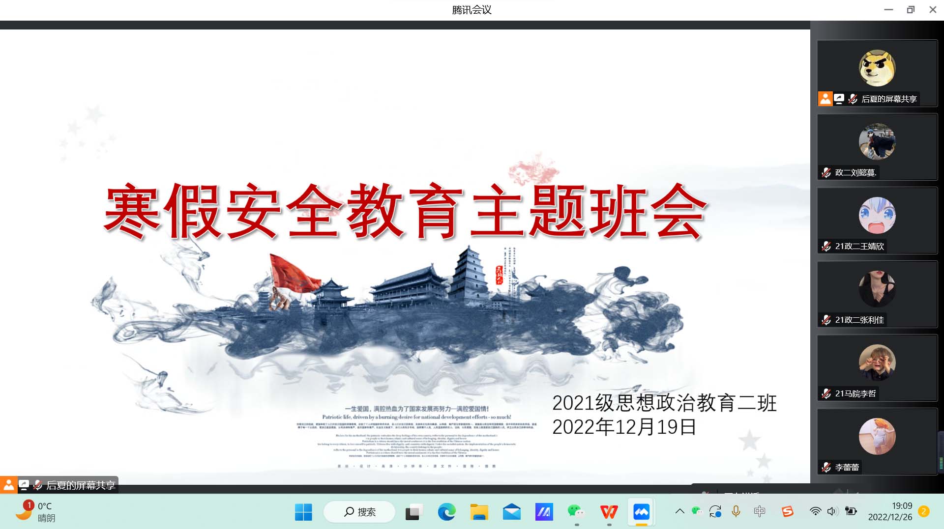 12月19日下午,德赢AC米兰官网2021级思想政治教育二班在腾讯会议召开寒假安全教育主题班会。2021级思想政治教育二班全体成员共同参加此次主题班会。班会由副班长任振豪主持。