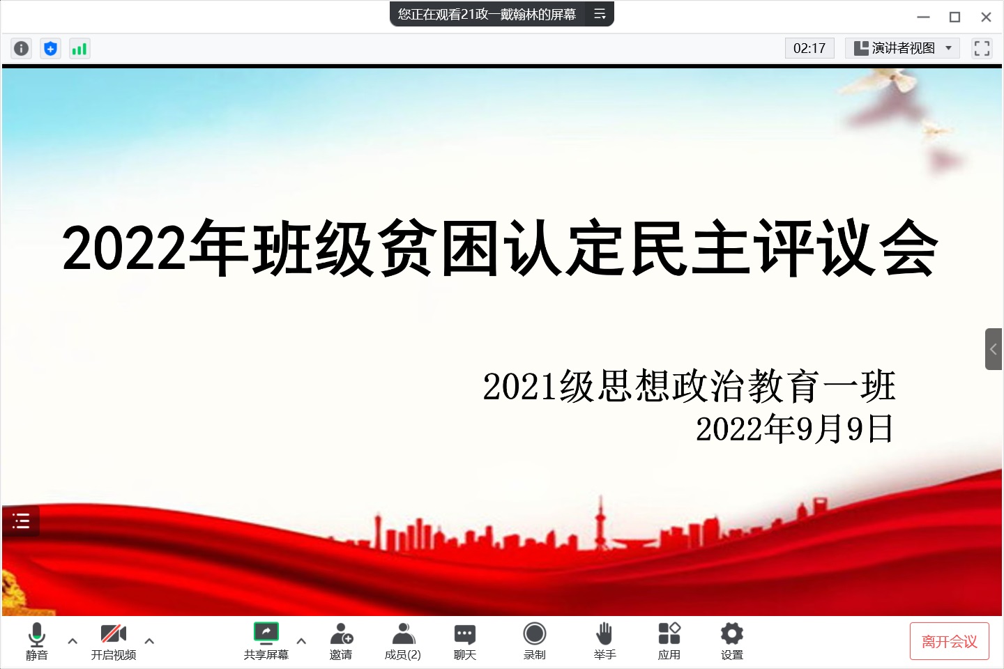 9月9晚上,德赢AC米兰官网2021级思想政治教育一班在腾讯会议召开线上2022年班级贫困认定民主评议会。评议会由辅导员曹菁菁、学生会权益保障部成员及2021级思想政治教育二班评议小组成员参加。评议会由班长戴翰林主持。