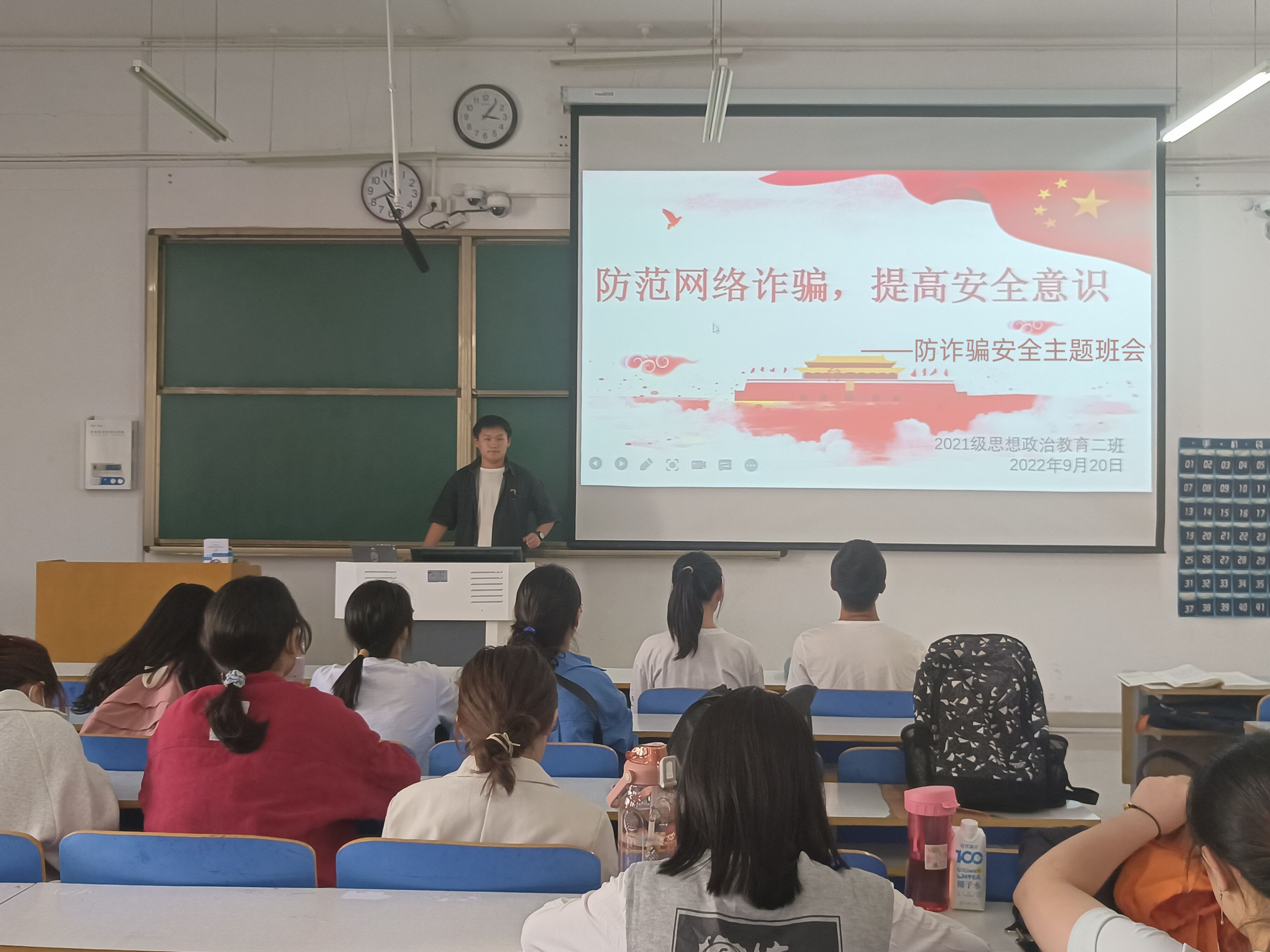 9月20日上午,德赢AC米兰官网2021级思想政治教育二班在社科楼514教室召开“防范网络诈骗,提高安全意识”防诈骗安全主题班会。2021级思想政治教育二班全体成员参加此次班会。班会由副班长任振豪主持。
