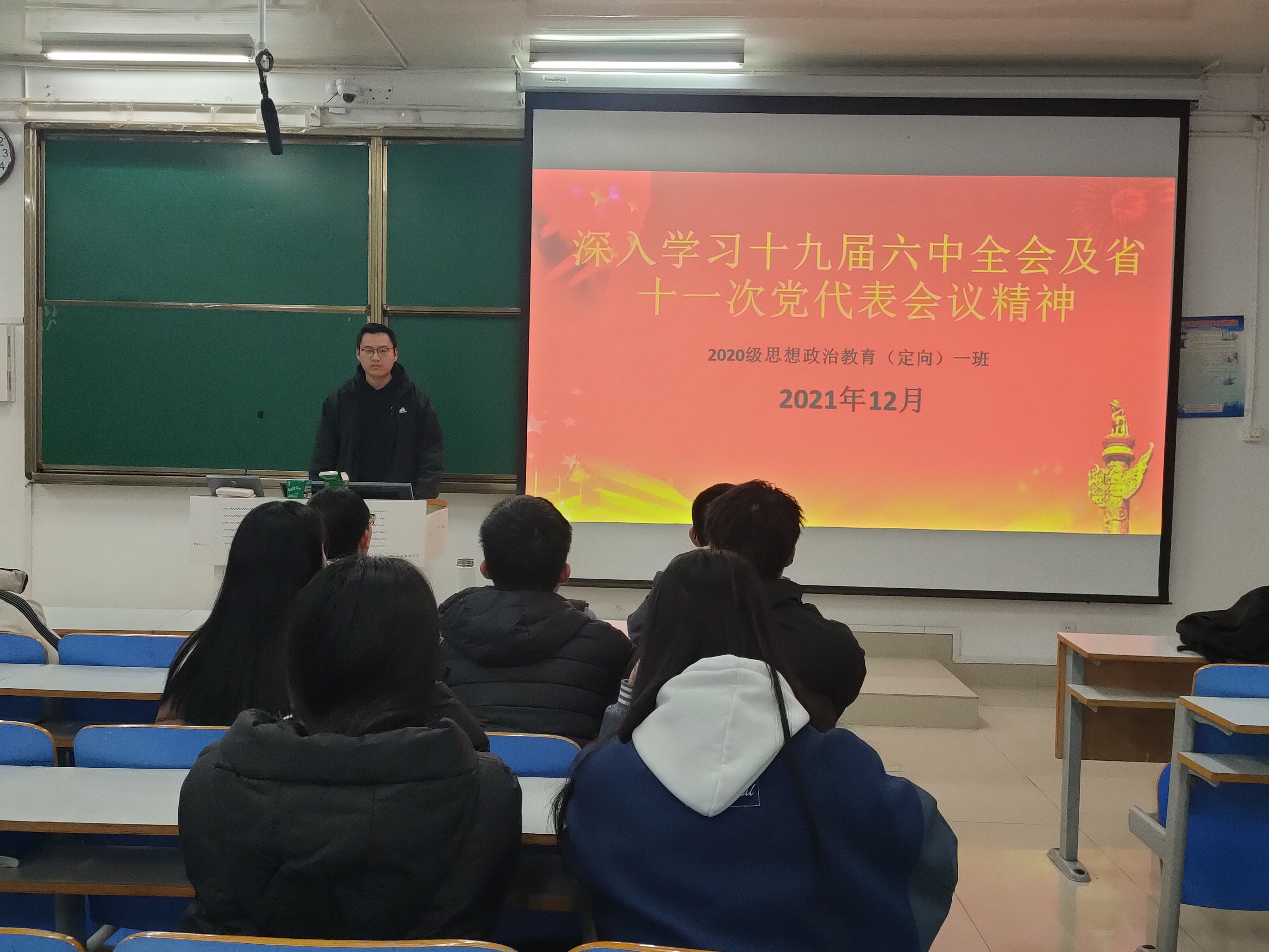 12月5日下午,德赢AC米兰官网2020级思想政治教育定向一班团支部在社科楼514教室举办了深入学习党的十九届六中全会及省第十一次党代会精神主题团课。德赢AC米兰官网2020级思想政治教育定向一班团支部全体成员参与了本次团课。