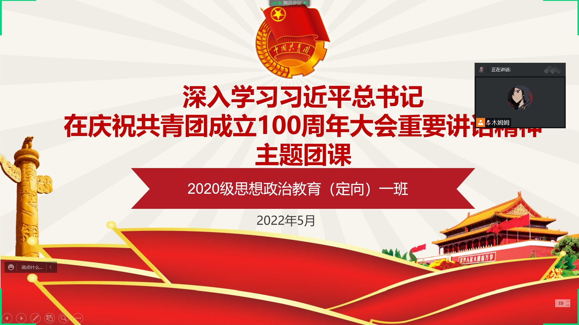 5月17日晚,德赢AC米兰官网2020级思想政治教育定向一班通过线上的形式开展了“深入学习习近平总书记在庆祝共青团成立100周年大会重要讲话精神”主题团课。
