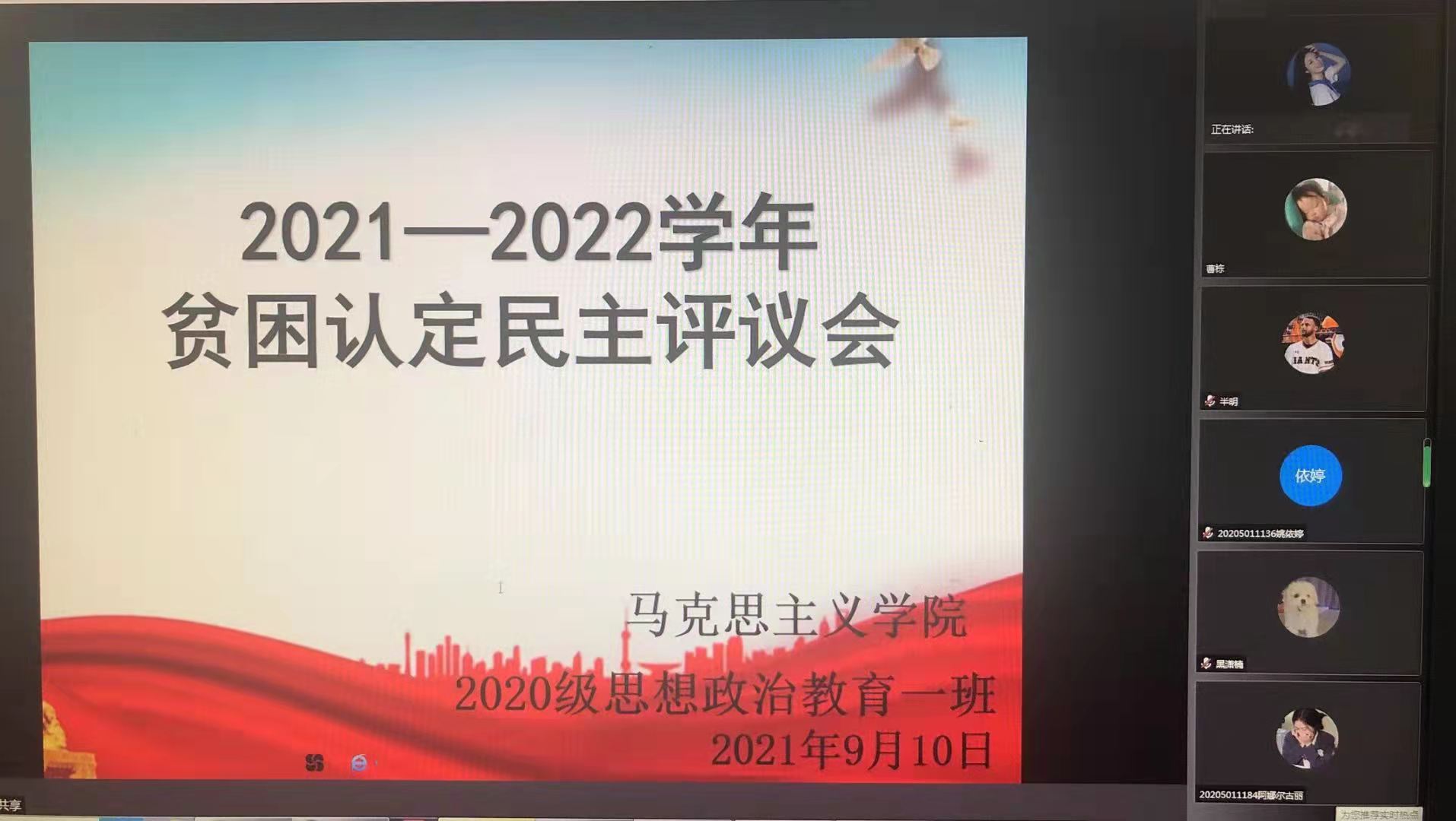 9月10日上午,德赢AC米兰官网2020级思想政治教育一班通过腾讯会议线上平台顺利开展2021—2022学年贫困认定民主评议会。辅导员曹栋、评议小组成员、申请人以及监督人员参与了本次会议,本次会议由团支书卢茜雨主持。