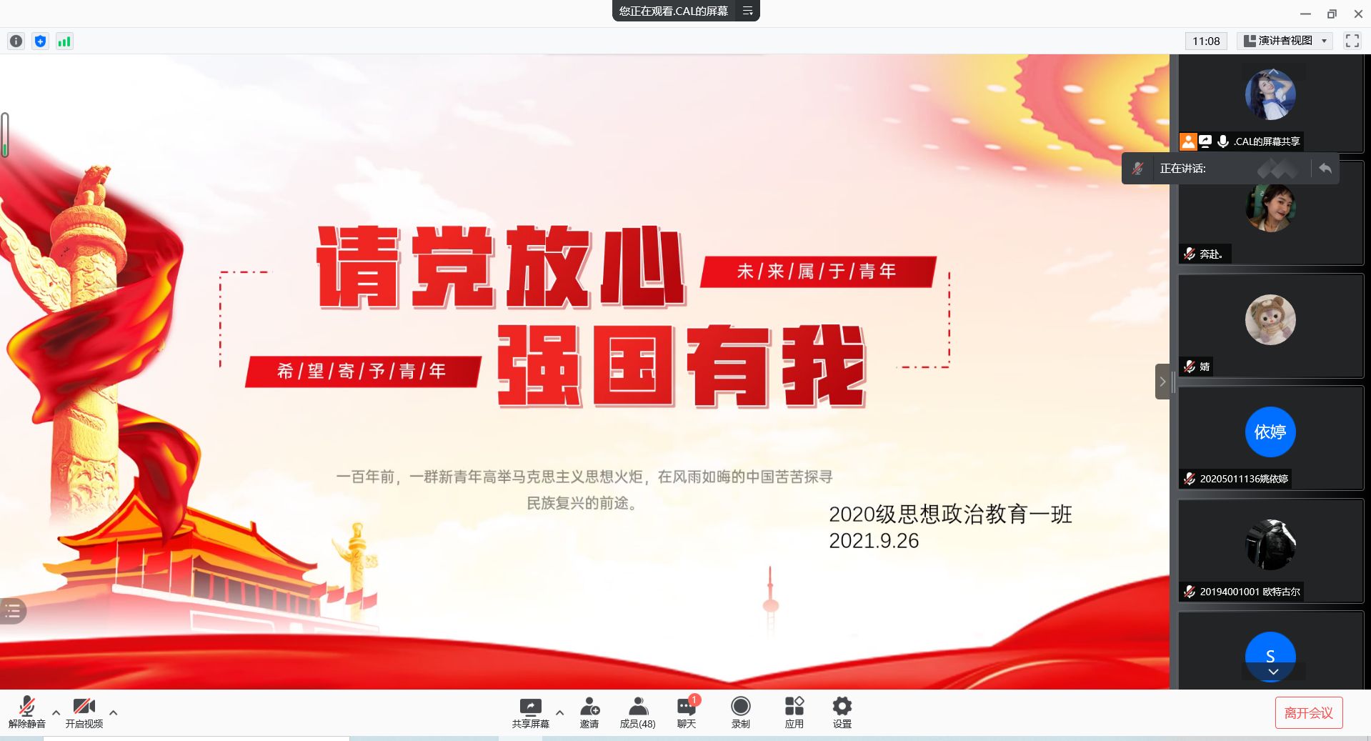 9月26日晚上,德赢AC米兰官网2020级思想政治教育一班在腾讯会议上召开主题为“请党放心,强国有我”的团支部大会。2020级思想政治教育一班全体同学全程参加本次团支部大会,大会由团支书卢茜雨主持。