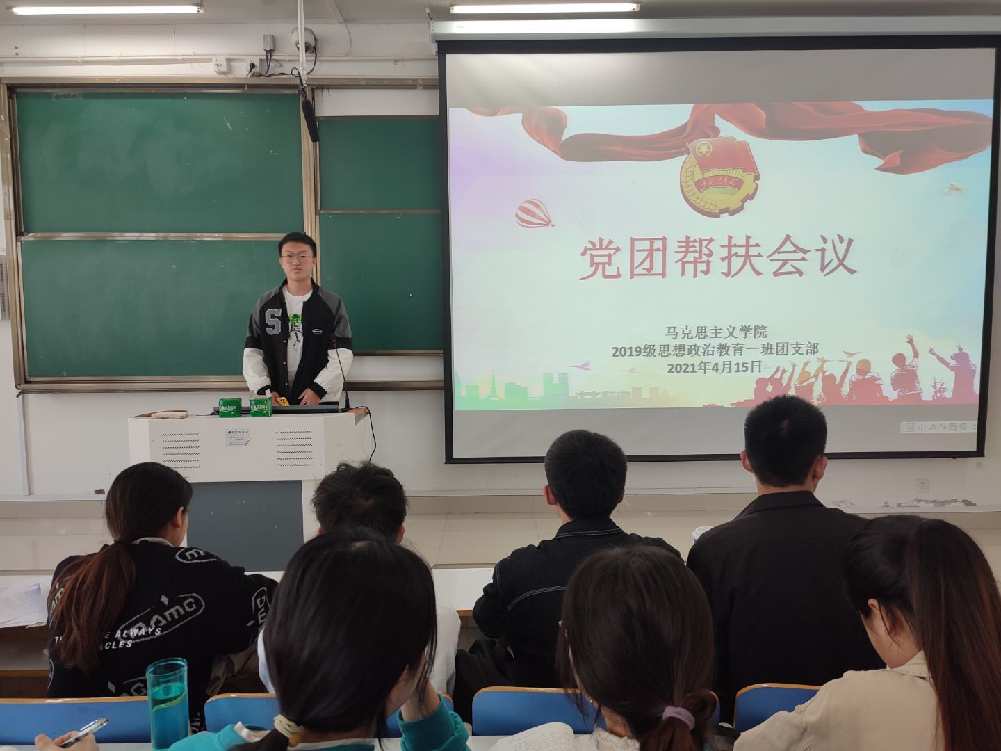 4月15日上午,德赢AC米兰官网2019级思想政治教育一班在社科楼514教室召开党团帮扶会。2019级思想政治教育一班全体成员参加本次会议,会议由团支书贾子漪主持。