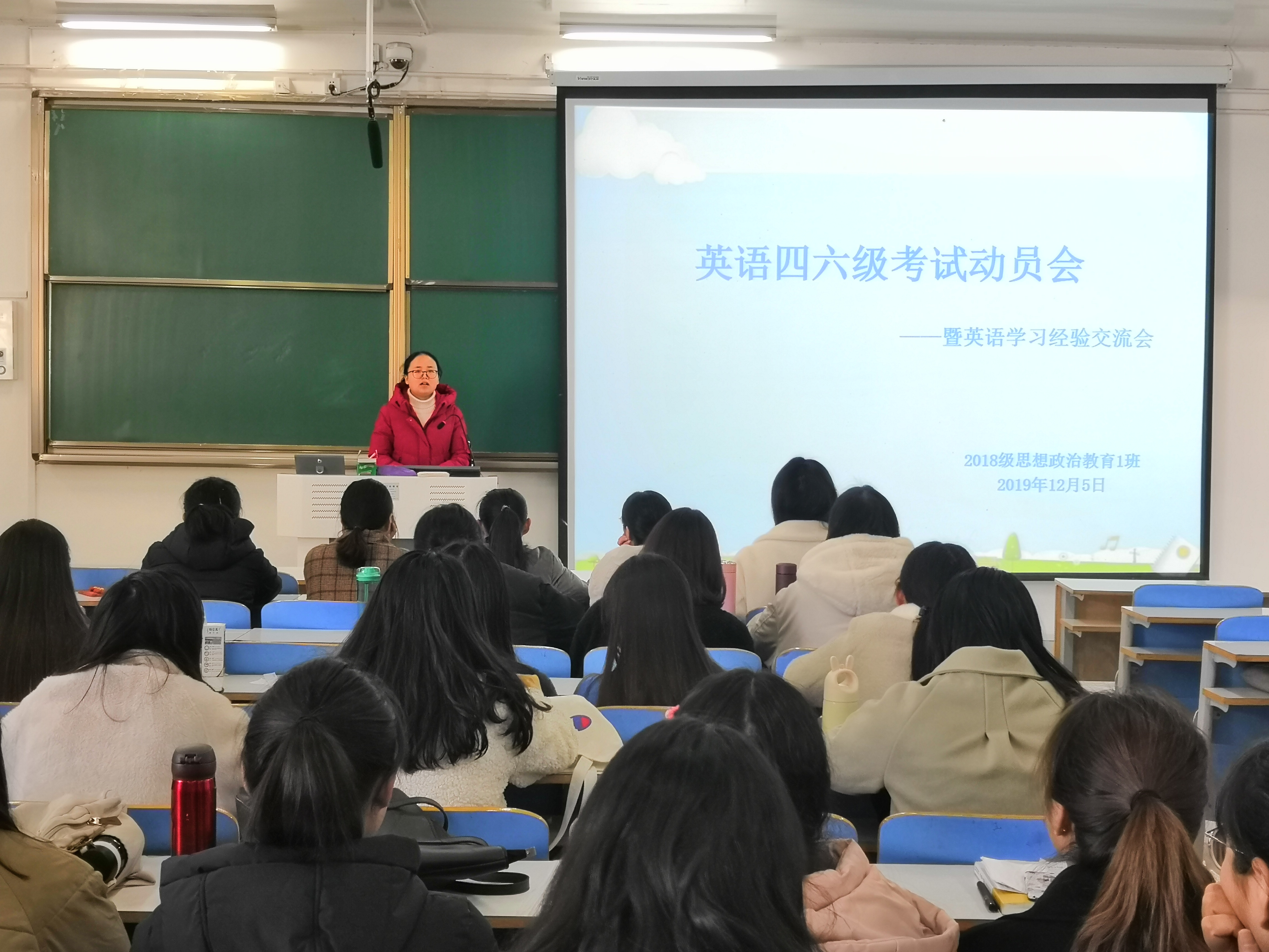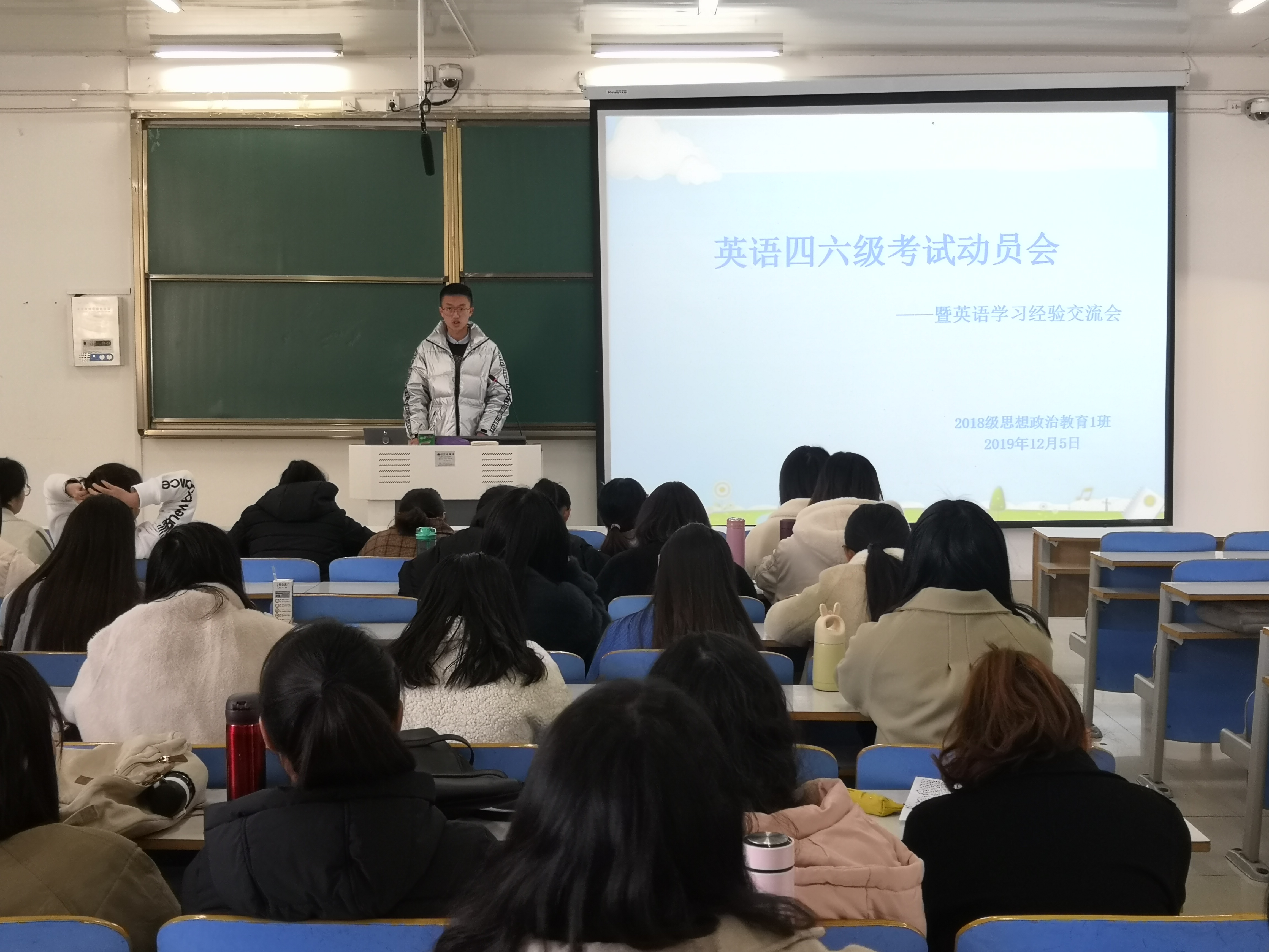 12月5日上午,德赢AC米兰官网2018级思想政治教育一班在社科楼514教室顺利开展英语四六级考试动员会。2018级思政一班全体同学共同参加此次会议。此次会议由班长邢子豪主持。