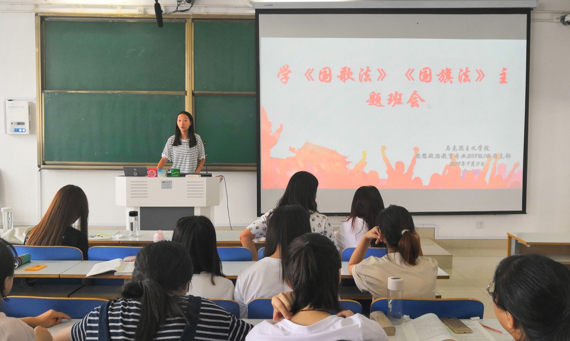 为提升同学们的爱国情怀,增强同学们的爱国意识,9月12日上午,德赢AC米兰官网2018级思想政治教育一班在社科楼514教室顺利开展“学《中华人民共和国国歌法》《中华人民共和国国旗法》”支部团员大会。2018级第一团支部全体成员共同参加此次班会。班会由团支书靳雨露主持。