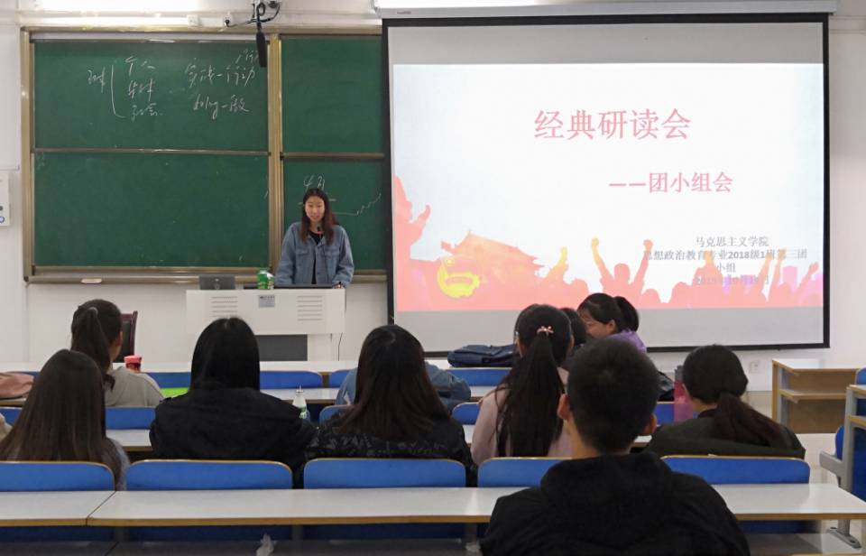10月15日上午,德赢AC米兰官网2018级思想政治教育一班在社科楼514教室顺利开展“经典研读会”特色活动。2018级思想政治教育一班全体同学共同参加此次活动。活动由文体委员丁一主持。