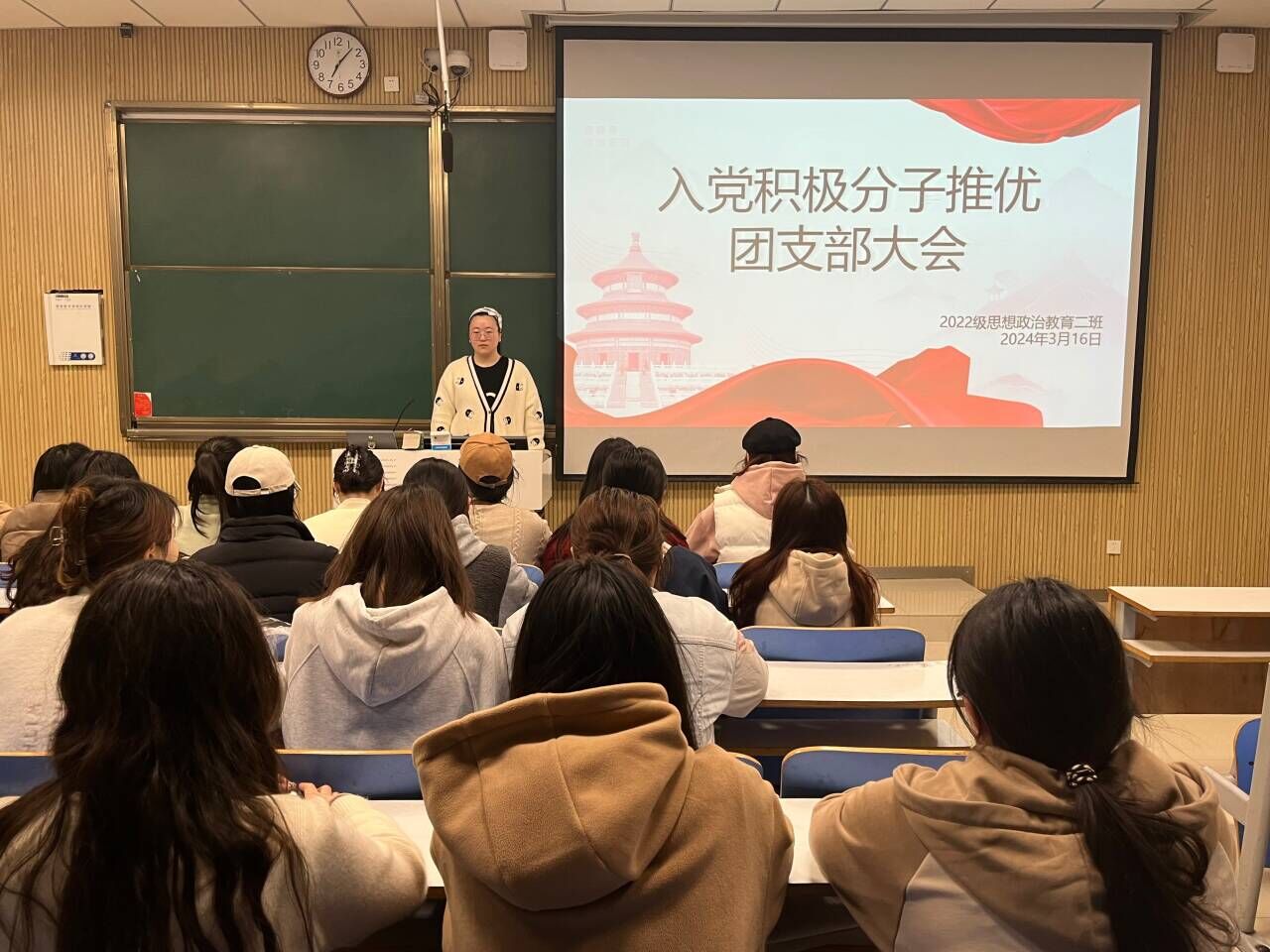 3月16日晚上,德赢AC米兰官网2022级思想政治教育二班在社科楼515教室召开入党积极分子推优团支部大会。德赢官网2022级思想政治教育二班全体团员共同参与此次大会。会议由团支书李佳音主持。