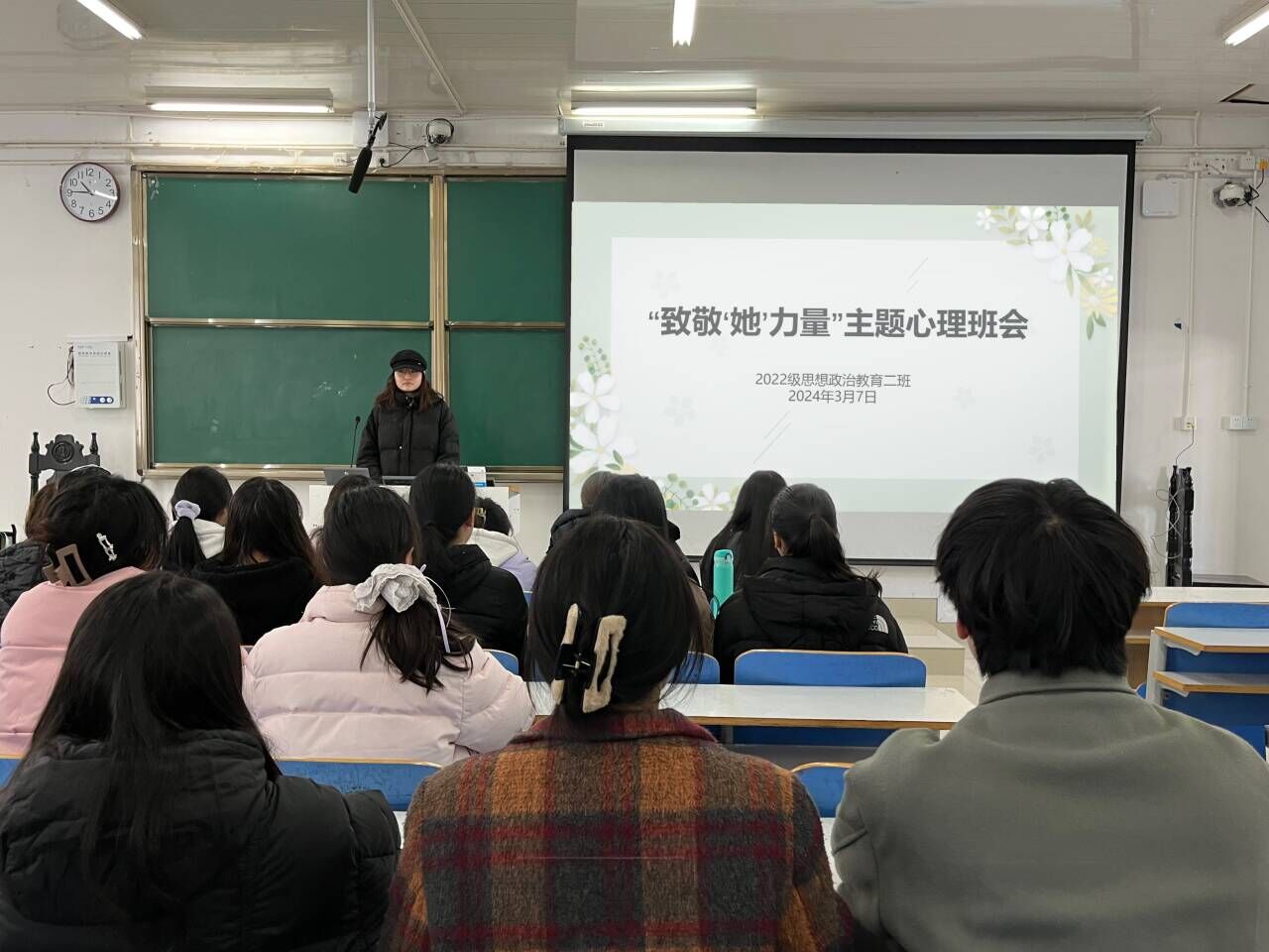 3月7日上午,德赢AC米兰官网2022级思想政治教育二班在社科楼514教室召开“致敬‘她’力量”主题班会。德赢官网2022级思想政治教育二班全体成员共同参与此次班会。会议由心理委员张嘉芮主持。