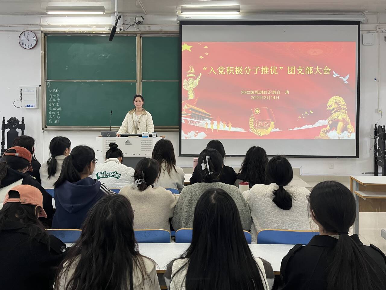 3月14日上午,德赢AC米兰官网2022级思想政治教育一班在社科楼514教室召开“入党积极分子推优”团支部大会,德赢官网2022级思想政治教育一班全体同学共同参与本次大会,大会由团支书李佳茹主持。