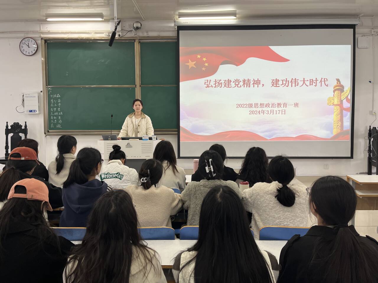 3月17日上午,德赢AC米兰官网2022级思想政治教育一班在社科楼514教室召开“弘扬建党精神,建功伟大时代”主题团课,德赢官网2022级思想政治教育一班全体同学共同参与本次团课,团课由团支书李佳茹主持。