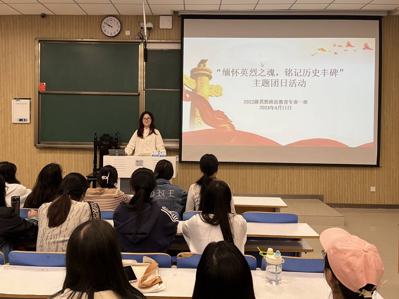 为缅怀革命英烈,弘扬爱国主义和民族精神,4月11日上午,德赢AC米兰官网2022级思想政治教育一班在社科楼515教室开展“缅怀英烈之魂,铭记历史丰碑”主题团课,德赢官网2022级思想政治教育一班全体同学共同参与本次团课,团课由团支书李佳茹主持。
