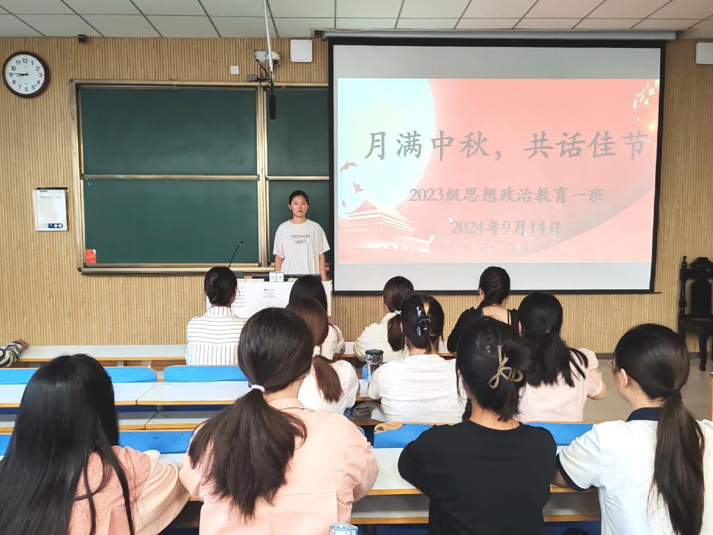桂香万里,情暖中秋。9月14日下午,在传统节日中秋节来临之际,德赢AC米兰官网2023级思想政治教育一班在社科楼515教室召开“月满中秋,共话佳节”主题班会。2023级思想政治教育一班全体同学参与本次班会,班会由班长张卓主持。