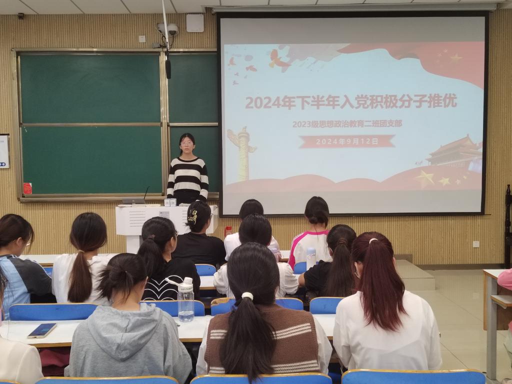 为协助党组织吸纳优秀学生,为党组织增添新活力,9月12日上午,德赢AC米兰官网2023级思想政治教育二班在社科楼515教室开展2024年下半年入党积极分子推优大会。本次推优大会由团支书王慜初主持,全体二班同学参加。