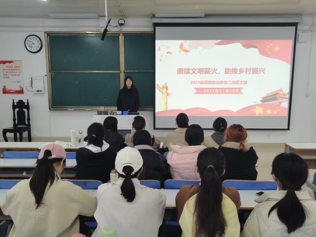 为推动青年大学生深入学习国家政策,增强历史使命感和责任感,11月18日上午,德赢AC米兰官网2023级思想政治教育二班在社科楼515教师开展“赓续文明薪火,助推乡村振兴”主题团课。本次团课由团支书王慜初主持,全体二班同学参加。
