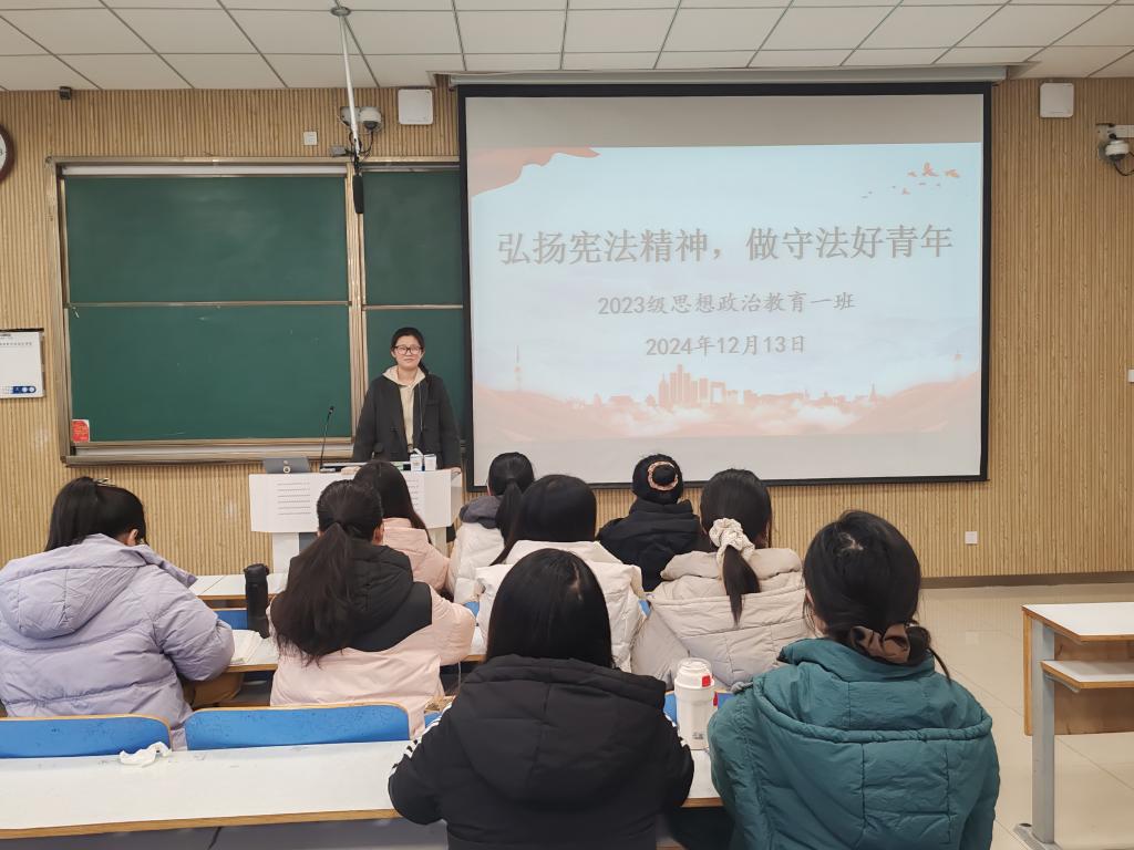 为增强我班学子的宪法意识,推动法治观念深入人心。2024 年12月13日,德赢AC米兰官网 2023 级思想政治教育一班召开“弘扬宪法精神,做守法好青年”主题班会。2023级思想政治教育一班全体同学参与本次团课,团课由团支书张卓主持。