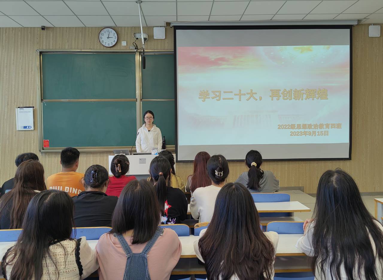 为学习把握好二十大精神,助力创造新成就,9月15日下午,德赢AC米兰官网2022级思想政治教育四班在社科楼515教室举办“学习二十大,再创新辉煌”主题团课。德赢官网2022级思想政治教育四班全体同学参与本次班会。会议由团支书牛志杰主持。