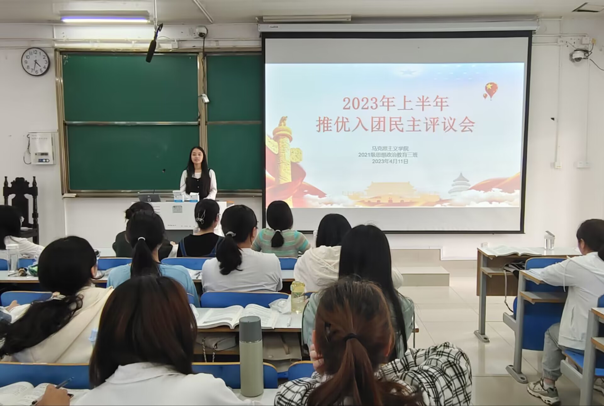 会议伊始,王岚霄指出,中国共产主义青年团是中国共产党领导的先进青年的群众组织,是广大青年在实践中学习中国特色社会主义和共产主义的学校,是党的助手和后备军。此次推优入团民主评议会的召开旨在壮大团支部力量,更好地为党服务。接着,她向大家介绍了本次推优入团的基本条件以及采用匿名一人一票的选举方式。随后,入团候选人马灿灿、韩奕晨等同学就个人学习、品德、对团的认识和入团动机等方面向大家做出汇报。最后,王岚霄发起集中投票,秦梦莹担任监票员,陈笑宇担任记录员。并将最终推优入团名单在班级群公示。