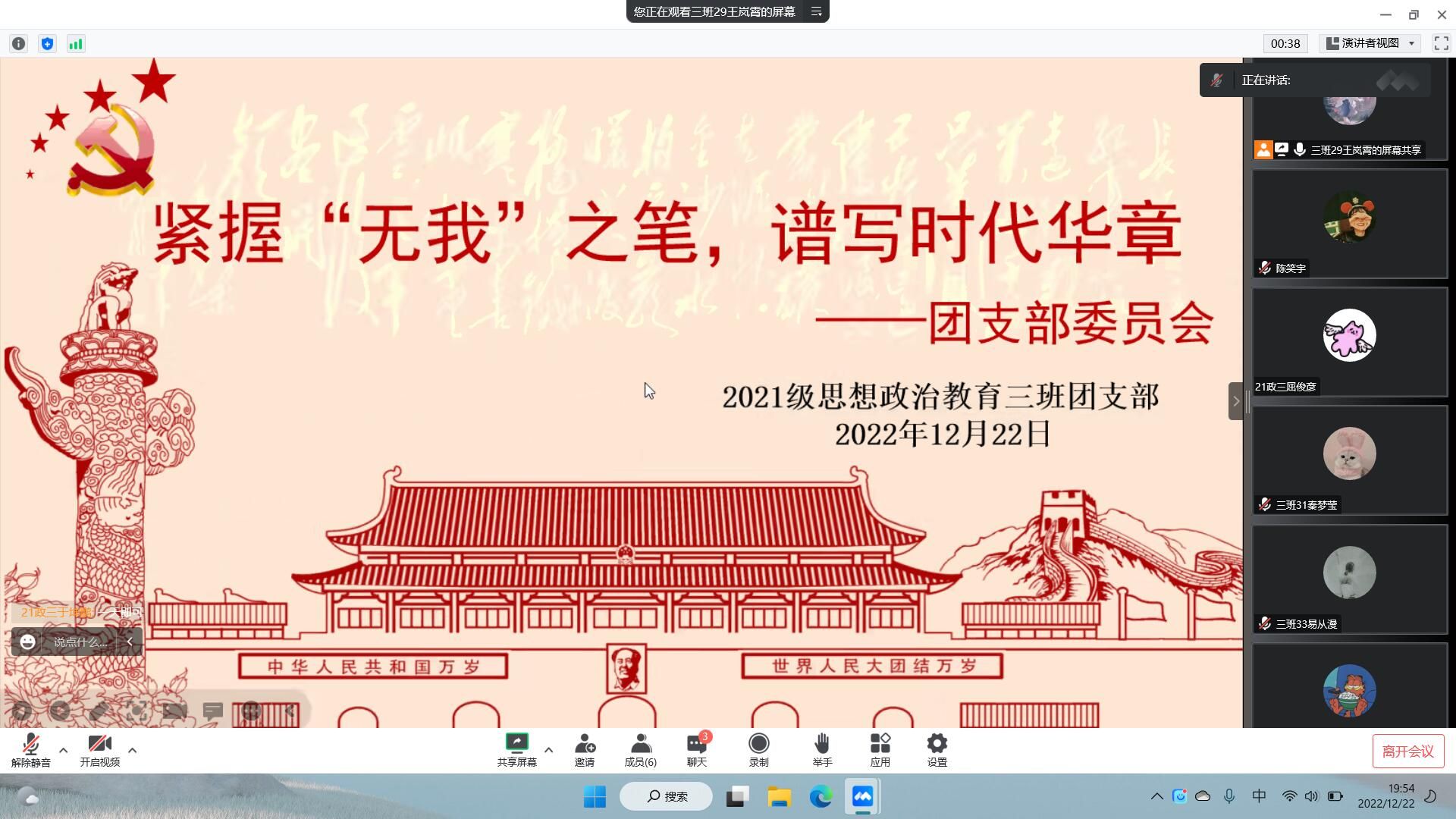 12月22日下午,德赢AC米兰官网2021级思想政治教育三班在线上召开“紧握‘无我’之笔,谱写时代华章”团支部委员会。德赢AC米兰官网2021级思想政治教育三班团支部委员会全体成员参与此次会议。会议由团支书王岚霄主持。
