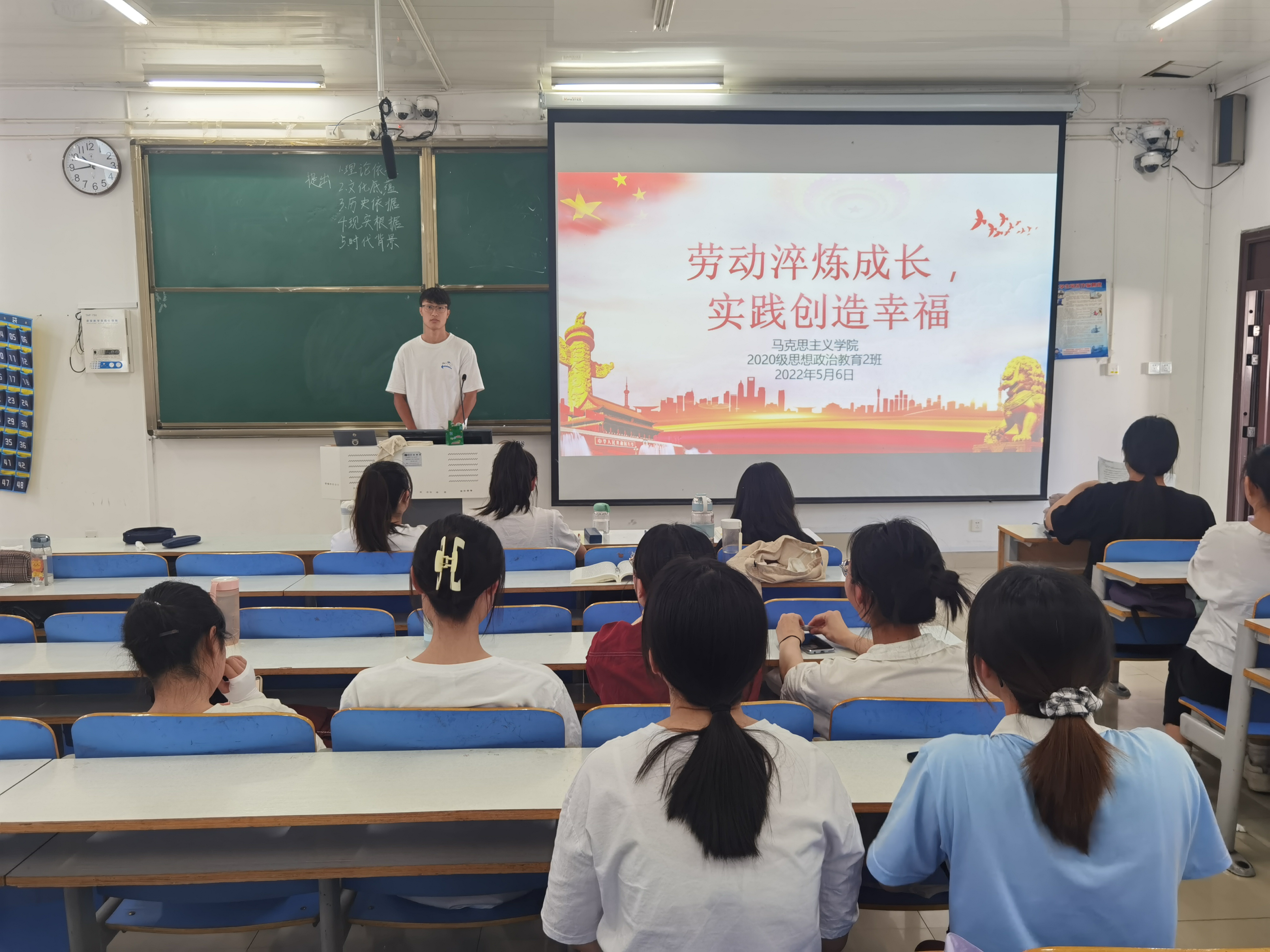为进一步加强劳动教育,提高同学们的劳动意识,5月6日下午,德赢AC米兰官网2020级思想政治教育二班、定向二班在社科楼514教室开展“劳动淬炼成长,实践创造未来”主题班会。2020级思想政治教育二班、定向二班全体成员参与本次班会。班会由班长陈宇航主持。