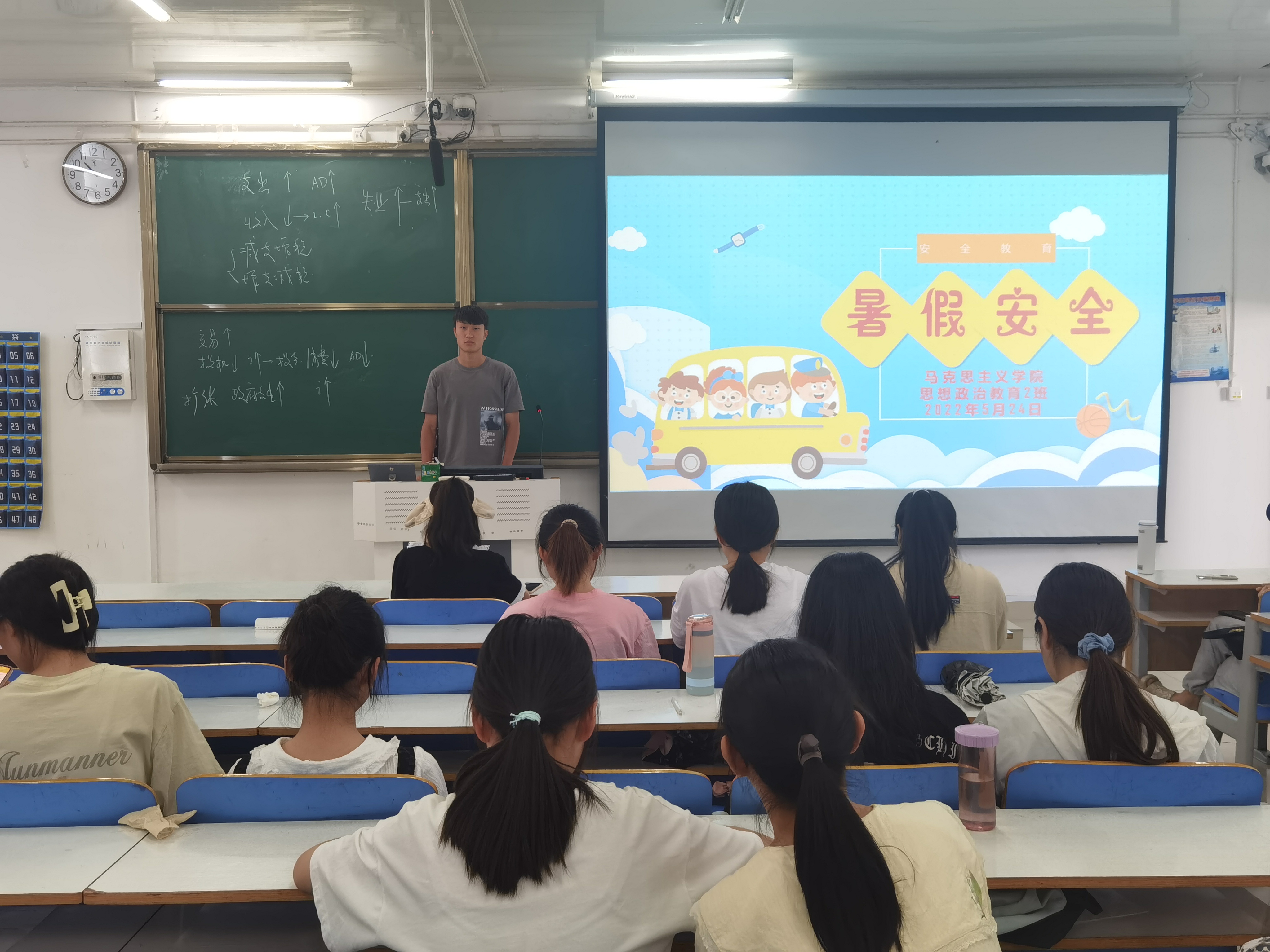 会议伊始,陈宇航强调了暑期来临之际召开本次安全教育主题班会的重要意义。他利用幻灯片放映的方式具体讲述了交通、饮食、水、电、火等五个方面的安全知识及注意事项,他表示,同学们在暑假期间要提高防火、防溺水等安全意识,避免发生火灾、交通等安全事故,注意各种网络诈骗,辨别打工陷阱,防止误入传销组织等。随后,陈宇航重点强调疫情防控的重要性,他指出,同学们在暑假期间要特别注意疫情防控,非必要不外出,时刻关注自身健康状况,按时完成健康打卡。班会最后,陈宇航向同学们分发了《暑期安全学生承诺书》《暑期安全家长告知书》,并提醒同学们认真阅读、积极落实。