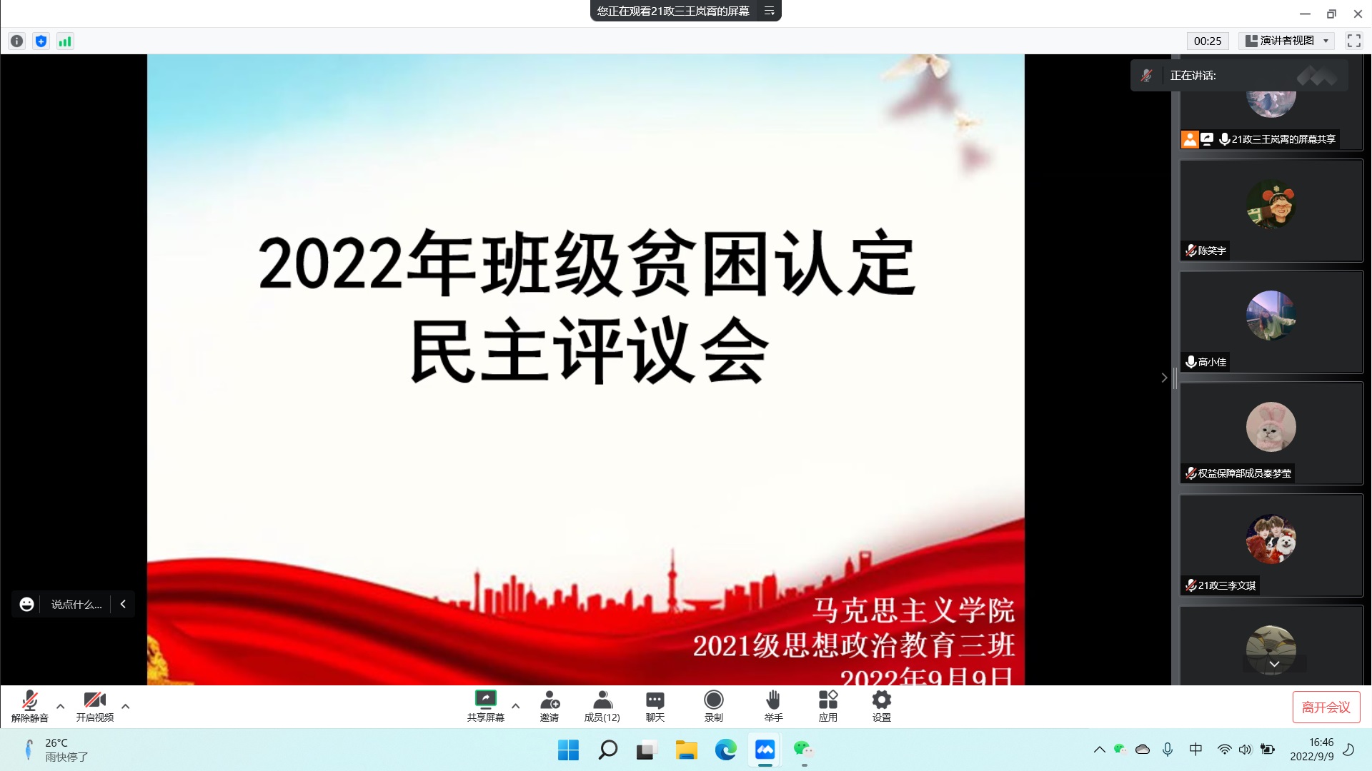9月9日下午,德赢AC米兰官网2021级思想政治教育三班召开线上2022年班级贫困认定民主评议会。2021级思想政治教育三班贫困认定委员团全体成员以及权益保障部秦梦莹、宣传委员陈笑宇参与此次会议。会议由团支书王岚霄主持。
