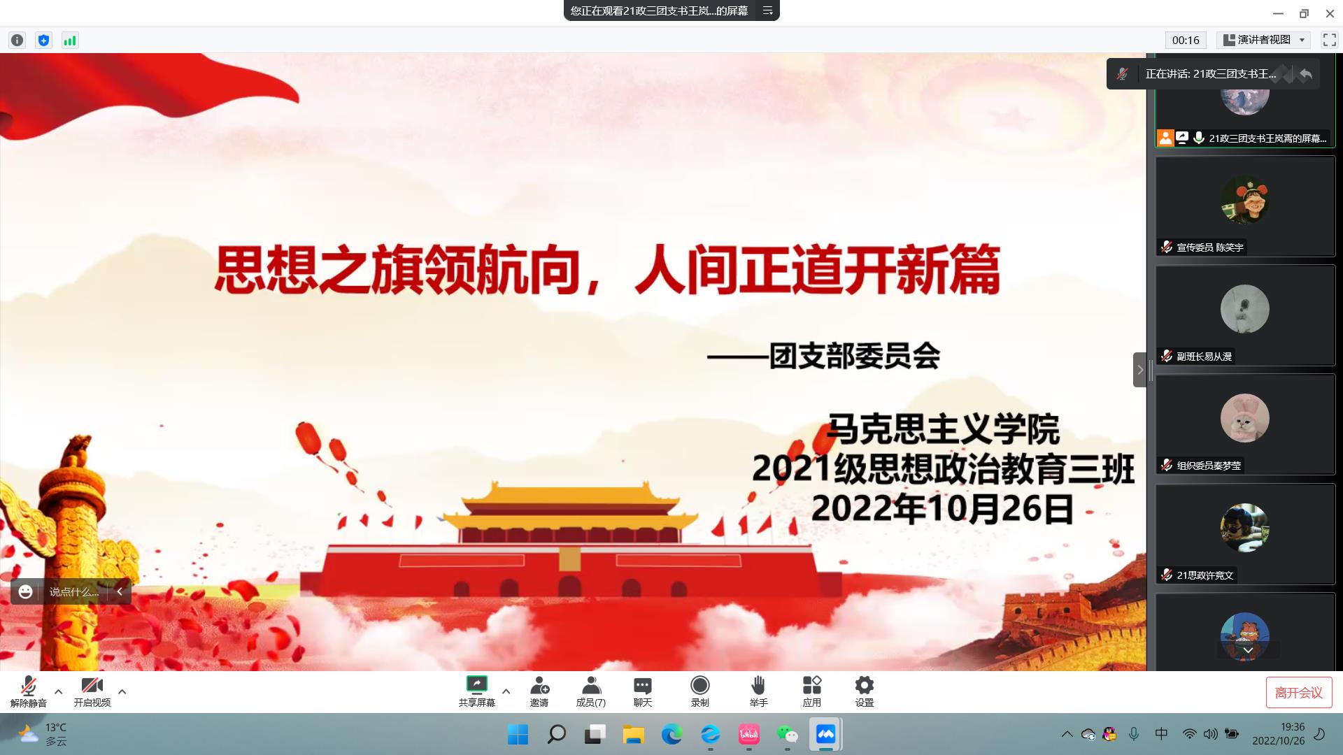 10月26日晚上,德赢AC米兰官网2021级思想政治教育三班召开线上“思想之旗领航向,人间正道开新篇”团支部委员会。德赢AC米兰官网2021级思想政治教育三班团支部委员会全体成员参与此次会议。会议由团支书王岚霄主持。