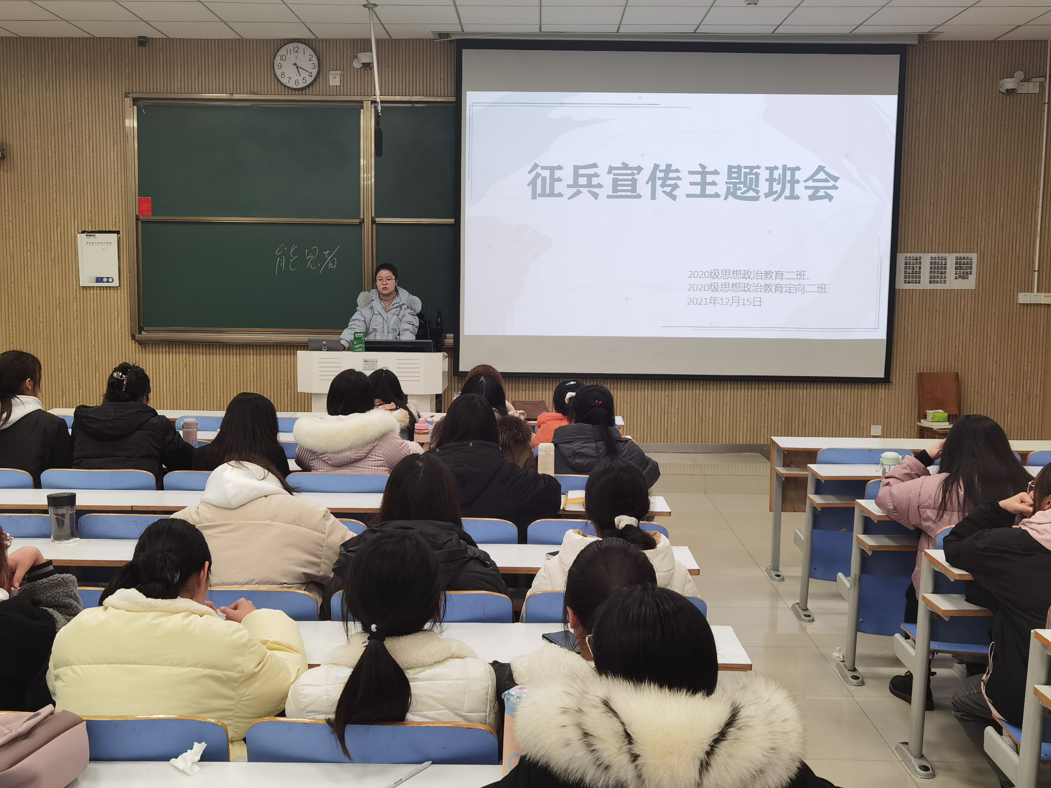 12月15日下午,德赢AC米兰官网2020级思想政治教育二班、定向二班在社科楼515教室召开征兵宣传主题班会。2020级思想政治教育二班、定向二班全体同学参与本次班会,辅导员高小佳出席会议并讲话。