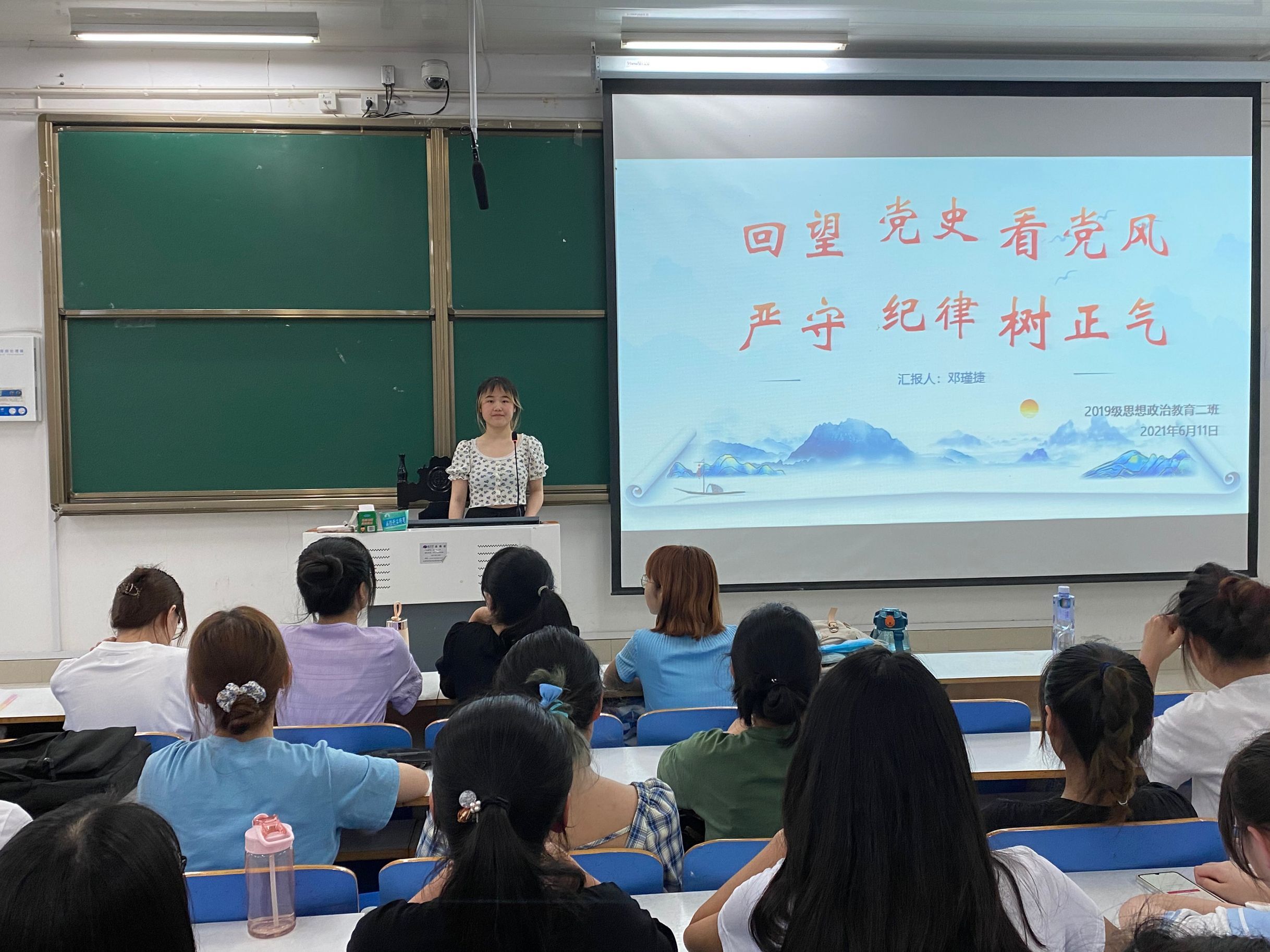 每一次历史回眸,都是一次精神洗礼;每一次党性教育,都是一次自我革命。6月11日上午,德赢官网2019级思想政治教育二班于社科楼516教室召开“回望党史看党风 严守纪律树正气”党史教育主题团课。2019级思想政治教育二班全体成员共同参会。会议由文体委员邓瑾捷主持。