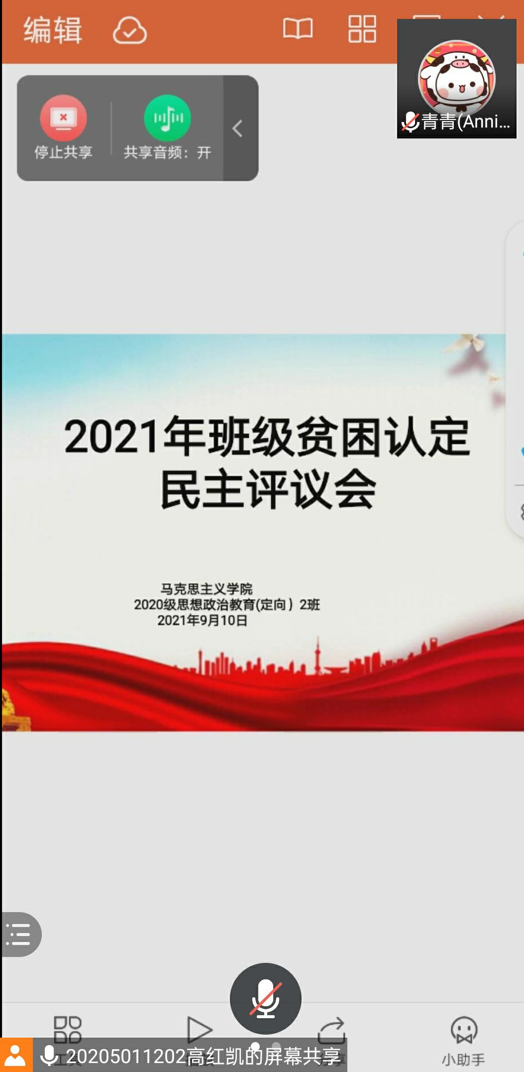 9月10日上午,德赢AC米兰官网2020级思想政治教育定向二班2021年班级贫困认定线上民主评议会通过腾讯会议顺利开展。班主任陶青青出席会议,评议小组全体成员按时到会,德赢官网权益保障部监督员宋佳怡全程监督。评议会由班长高红凯主持。