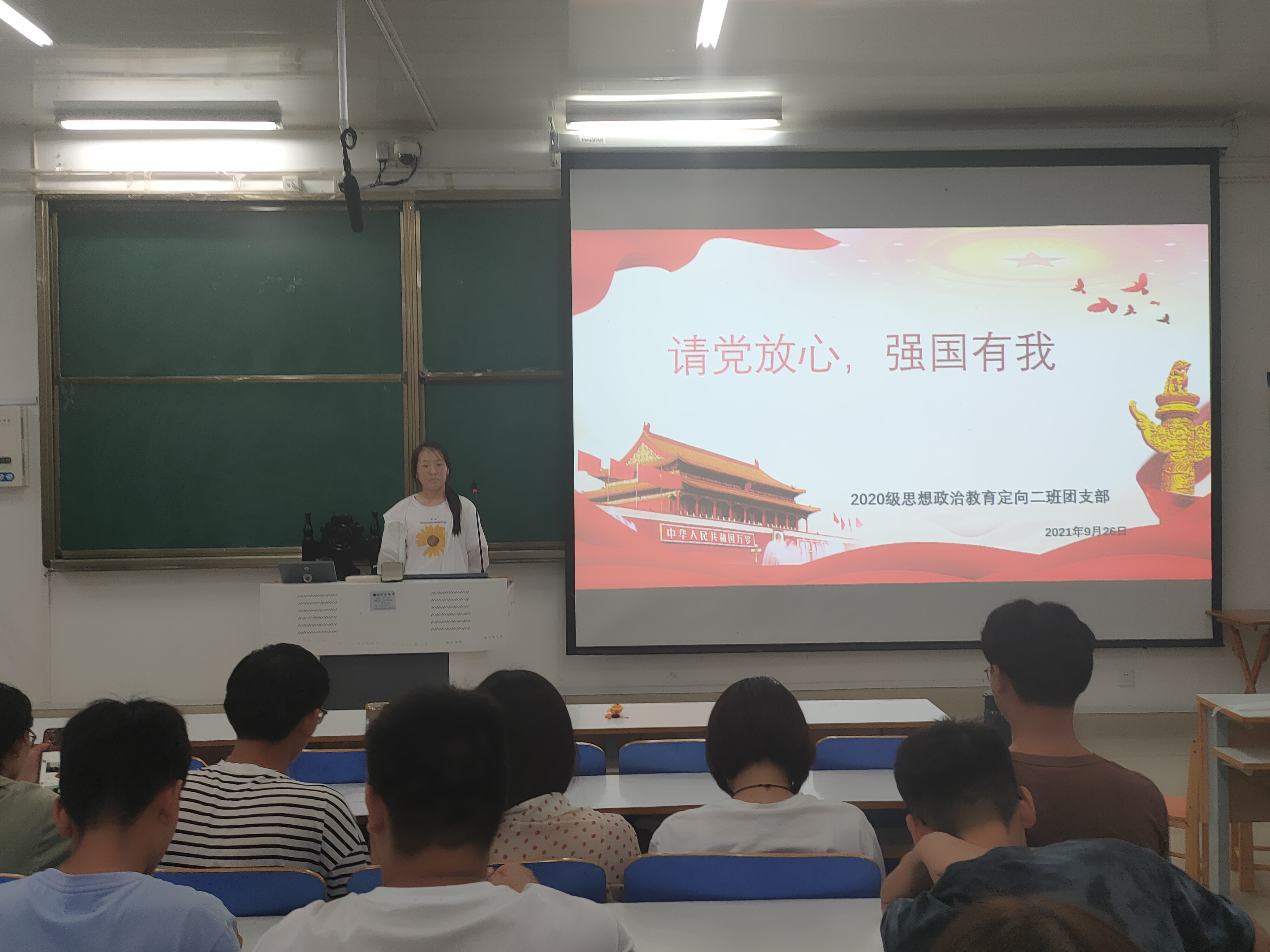 9月26日晚上,德赢AC米兰官网2020级思想政治教育二班、定向二班在社科楼514教室顺利开展“请党放心,强国有我”主题团课。二班、定向二班全体团员共同参加本次团课,团课由孙晶晶、黄敏主持。